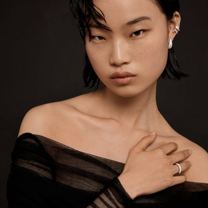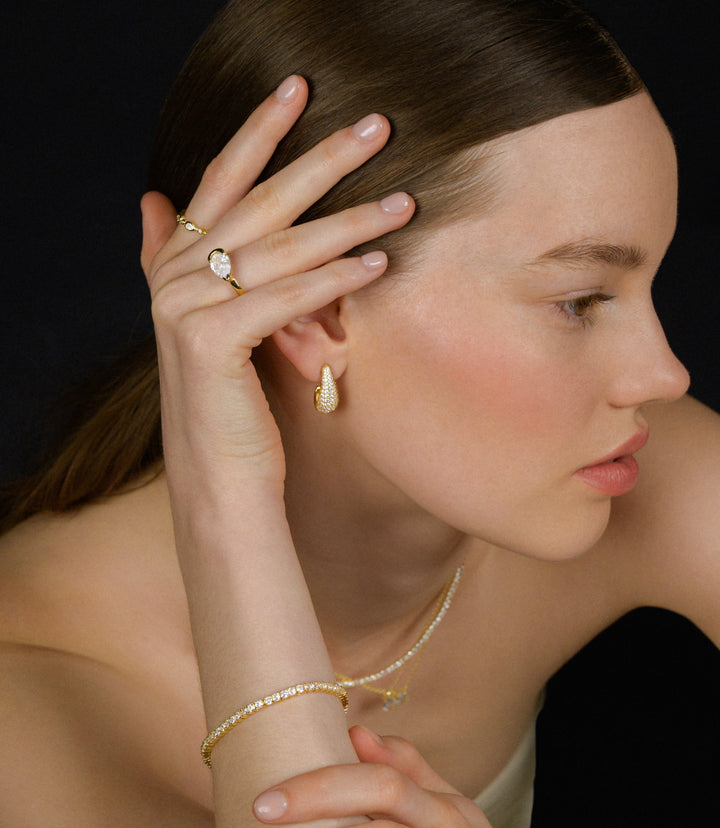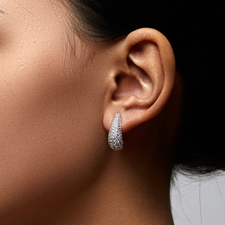 Enhance your style with our Aro Earrings. Featuring pavéd tear drop earrings, these will add a touch of elegance to any outfit. Elevate your look and feel confident with these stylish and versatile earrings.