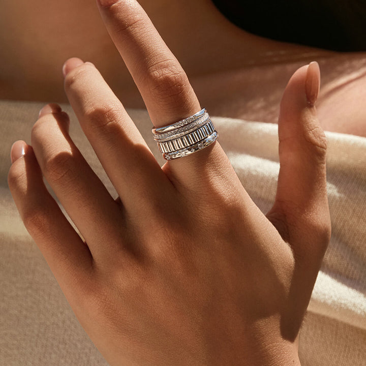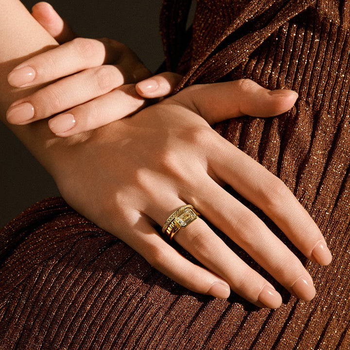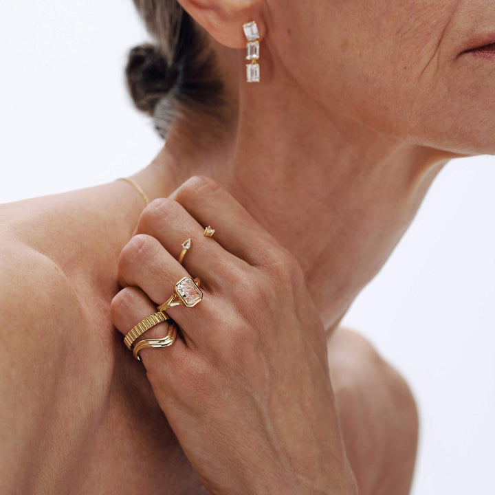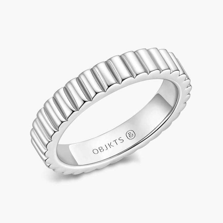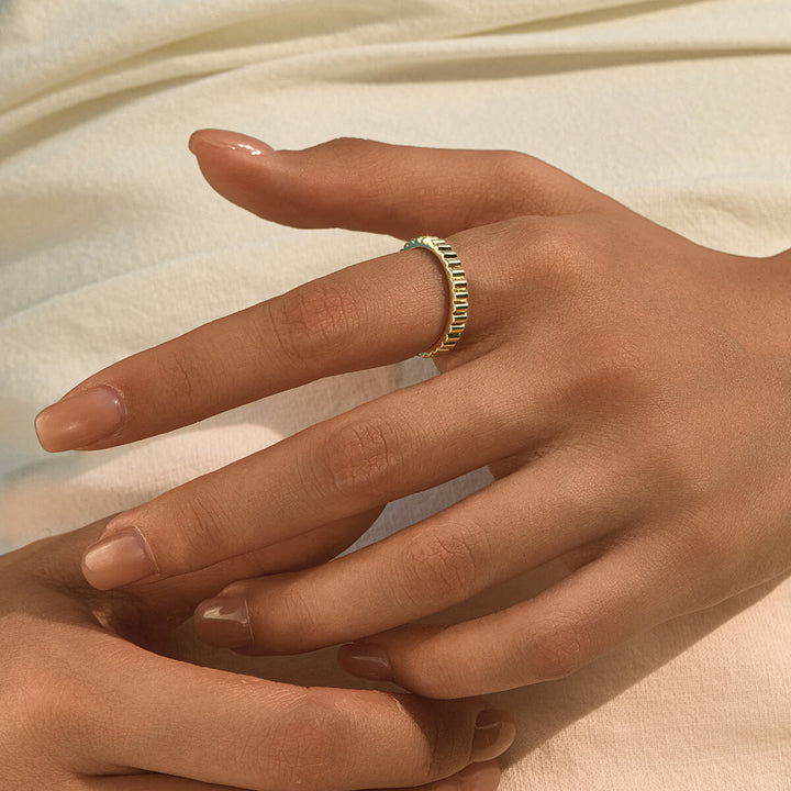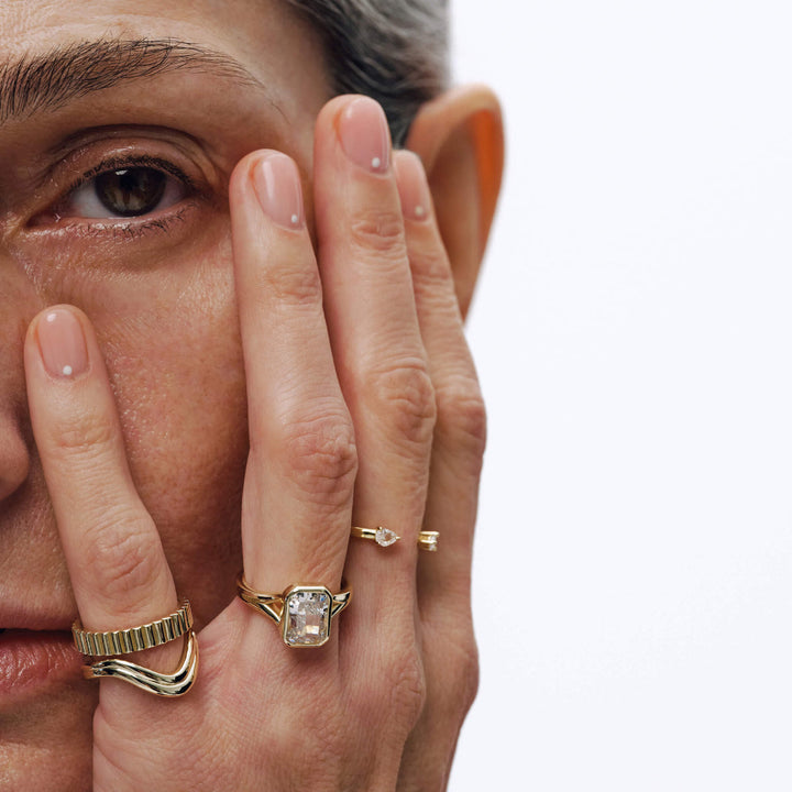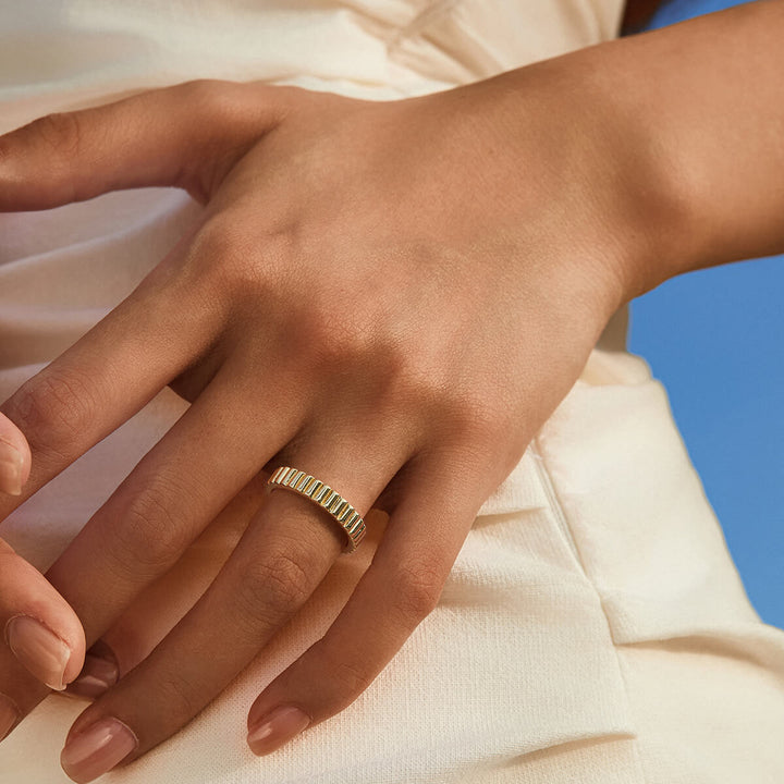Vintage-inspired with a sculptural twist, the Athena Band features a fluted ripple design that flows seamlessly. Its textured form catches the light with every movement, offering a timeless elegance that’s both subtle and striking—perfect for stacking or wearing solo.