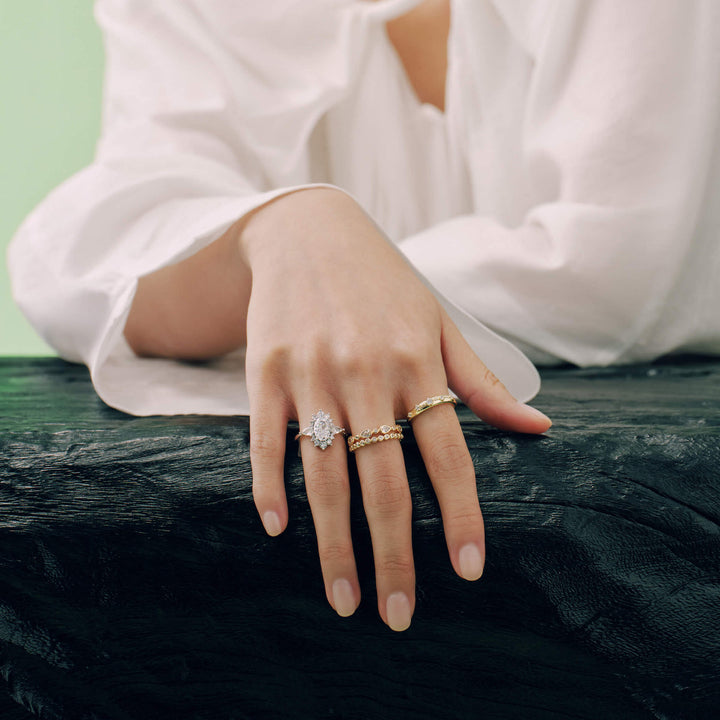 The Aurelia Ring is a vintage-inspired masterpiece featuring an exquisite oval cut stone and a unique, dazzling halo design. With its timeless design and impeccable craftsmanship, the Aurelia Ring is sure to capture the hearts of all who wear it.