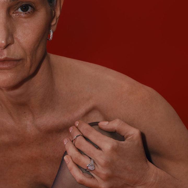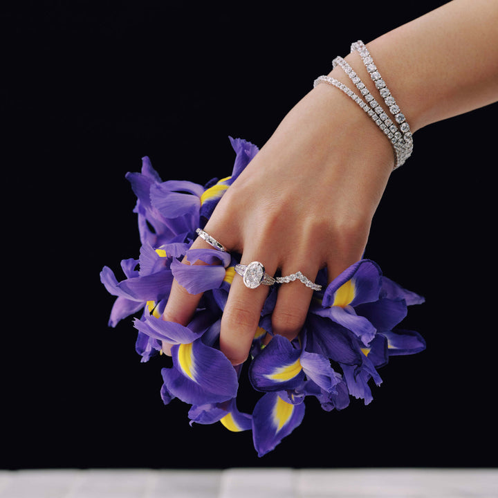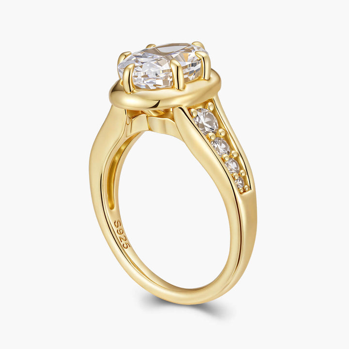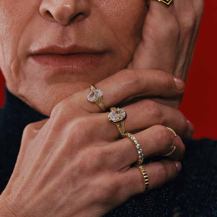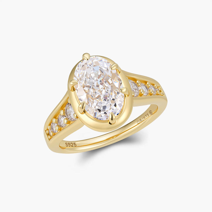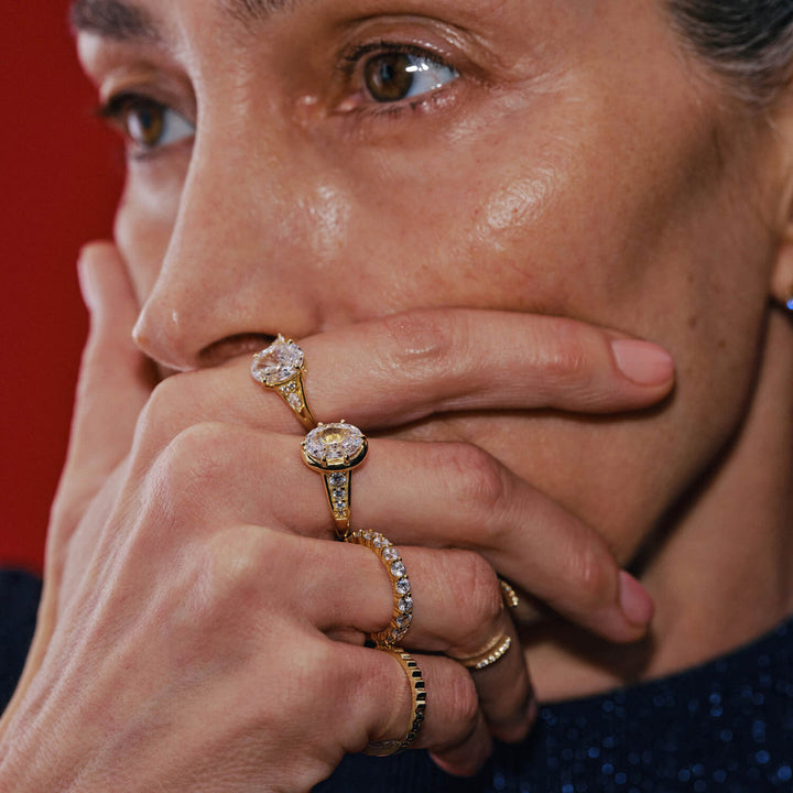 Charming and vintage-inspired, the Bonnie Ring features a central oval stone in a classic bezel setting, flanked by a soft gradient of round side stones. The clustered design creates a balanced, romantic silhouette - full of sparkle, character, and timeless appeal.