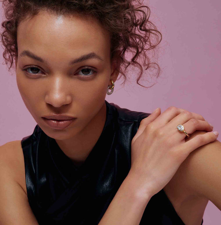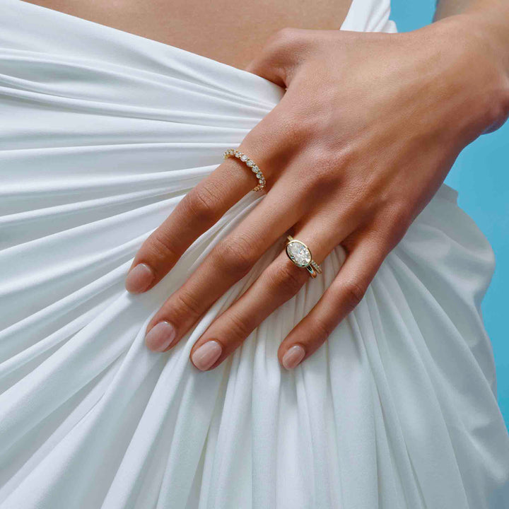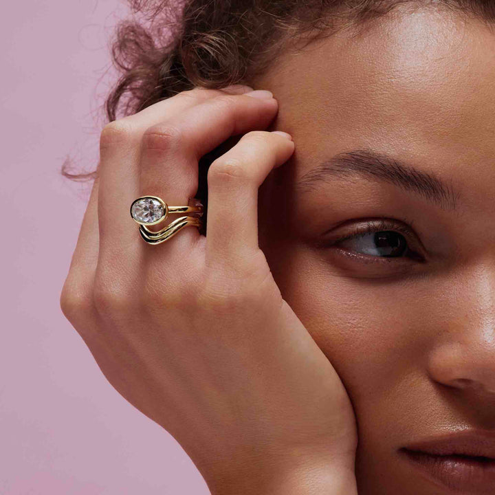 The Clara Ring showcases a stunning east-west oval stone elegantly secured in a sleek bezel setting. This design offers a modern twist on a classic shape, providing both style and durability for everyday wear. Its refined silhouette makes it a versatile addition to any jewellery collection
