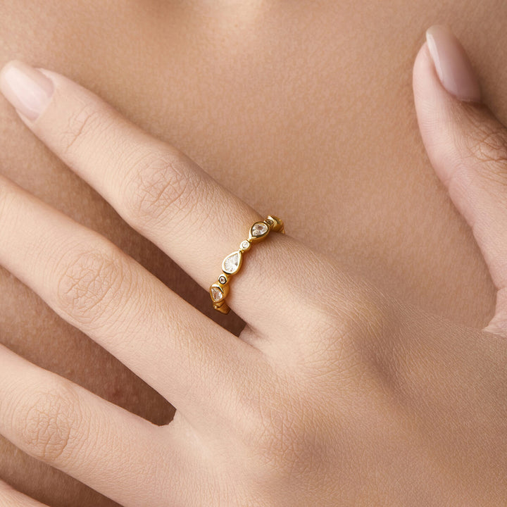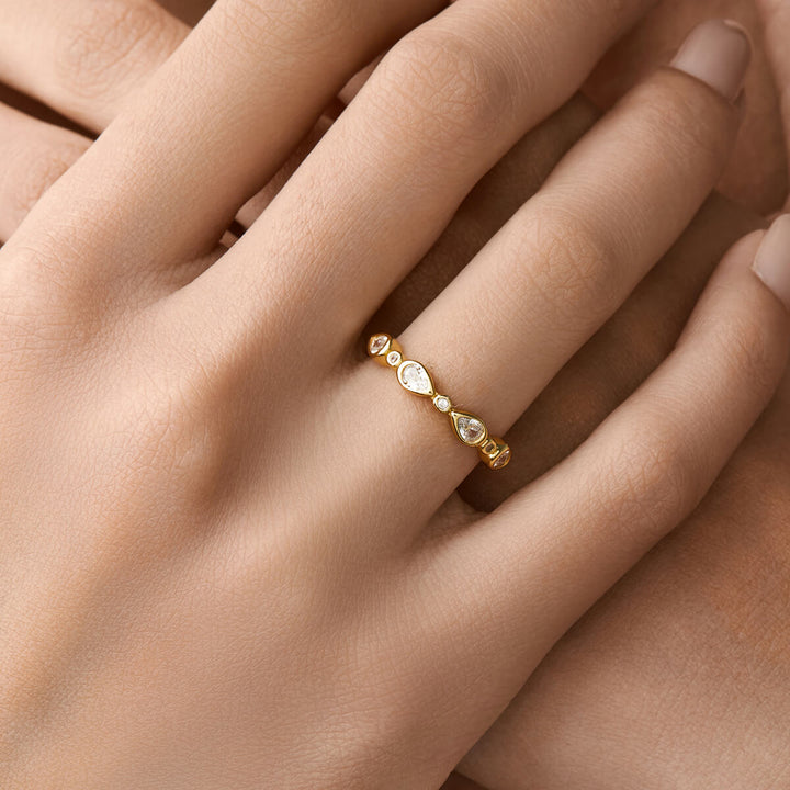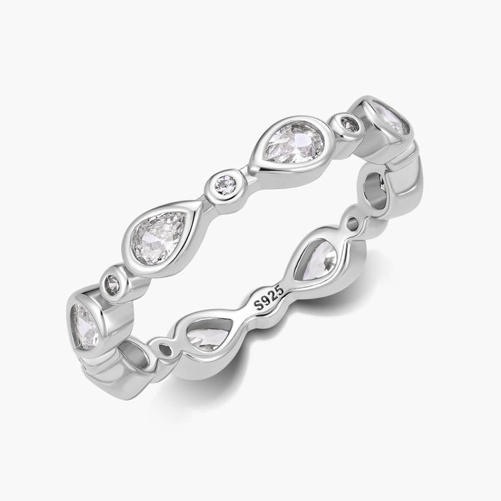 The Cleo Band is a stunning and unique bezel style eternity band, featuring a combination of pear and small round stones encased in a secure bezel setting. Show off your style with this elegant and timeless piece.