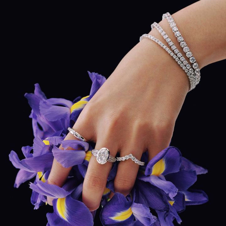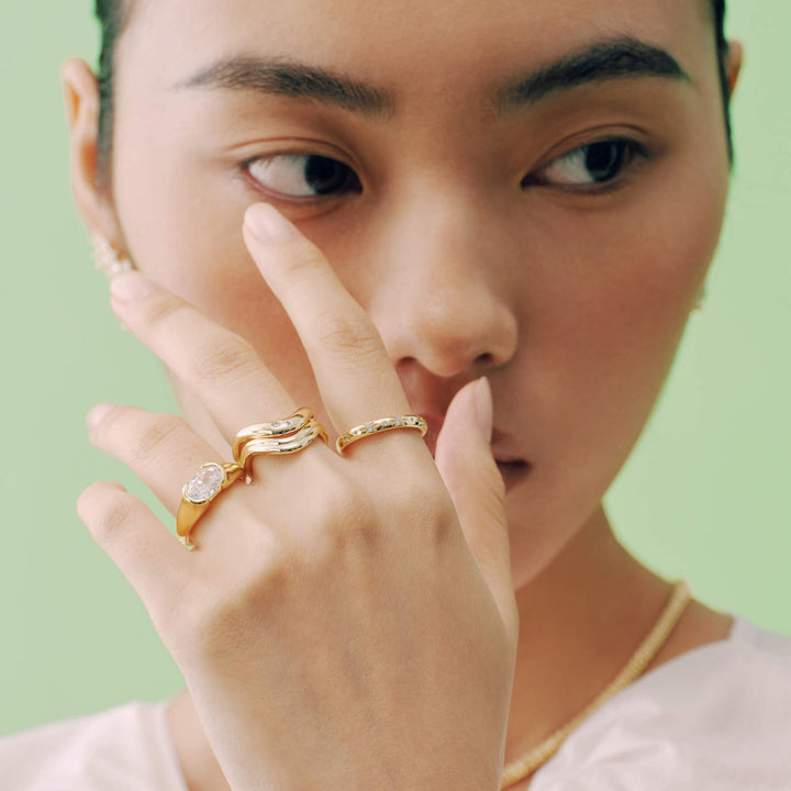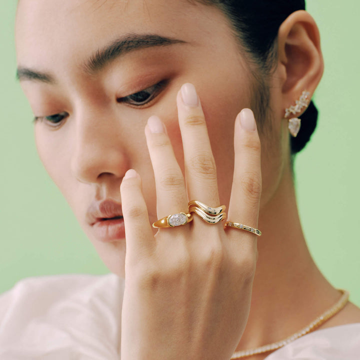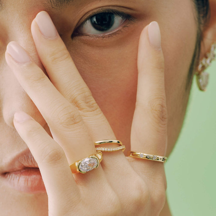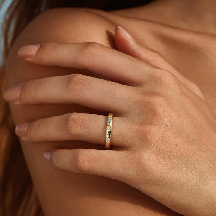 A delicate and timeless piece, the Cosette Band features petite round stones in an elegant alternating pattern. Its simple silhouette makes it perfect for stacking or wearing alone for a touch of refined sparkle. Understated yet full of charm, the Cosette is a graceful everyday essential.