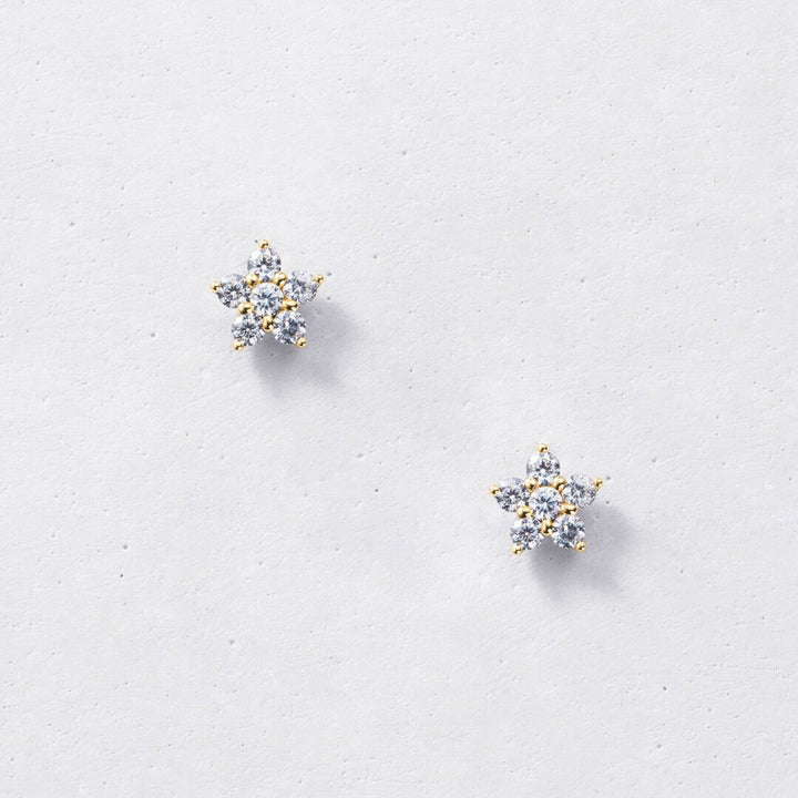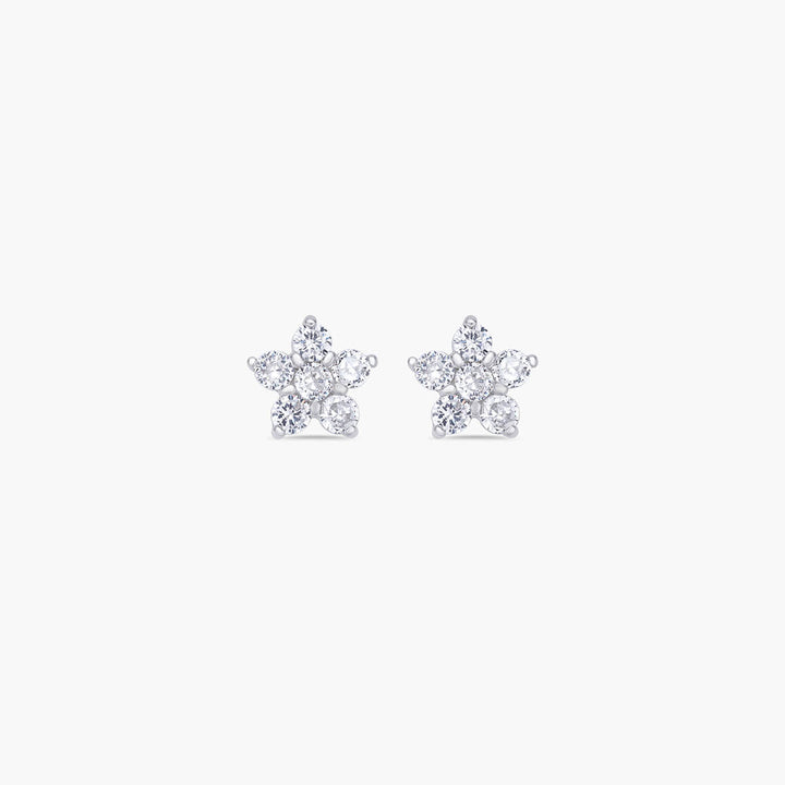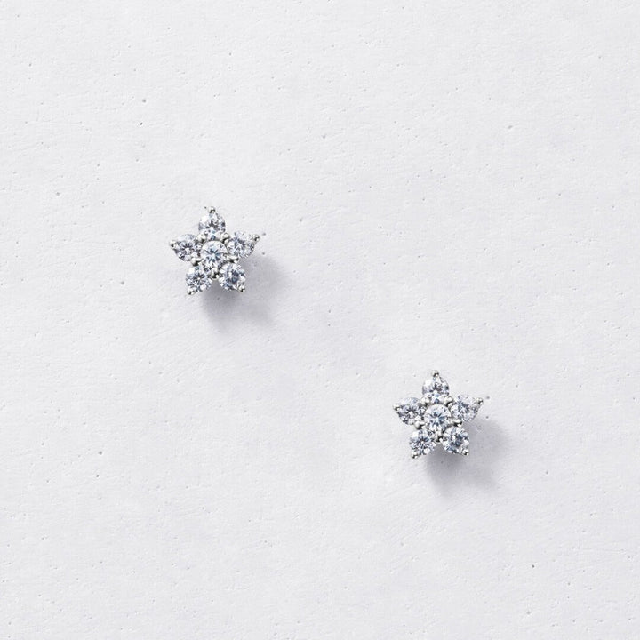 - A pair of flower-shaped stud earrings- 925 Sterling Silver, Rhodium-plated- Cubic Zirconia, 925 sterling silver body and earring post, hypoallergenic stainless steel butterfly- Studs size: 6.3mm height