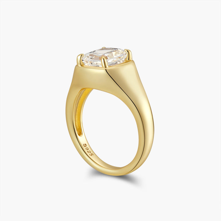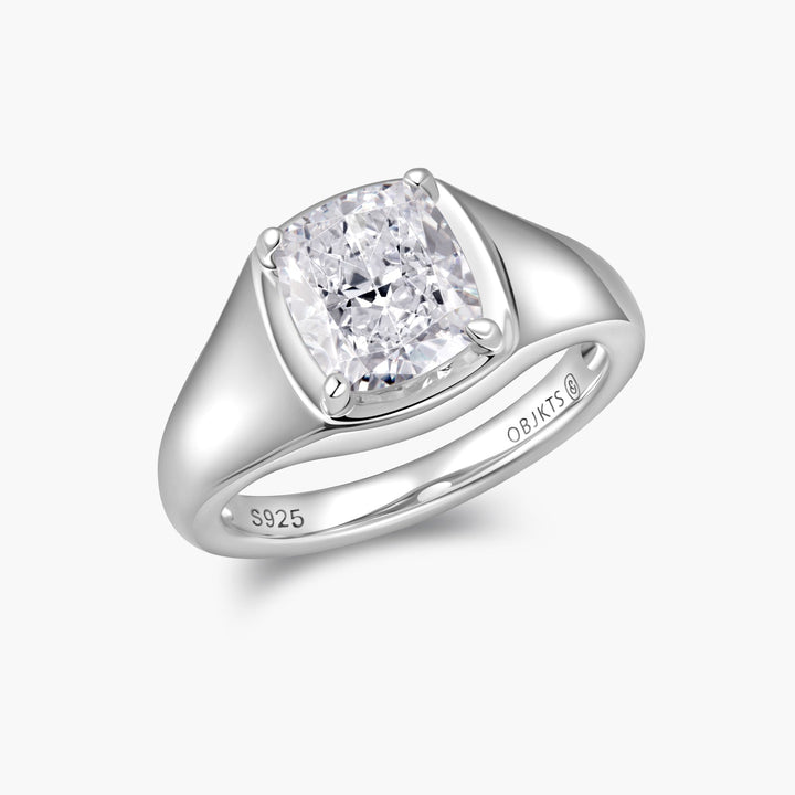 The Diosa Ring features a boldly framed bezel cushion-cut center stone. Its strong, sculptural design gives a modern edge while keeping the look effortlessly refined.