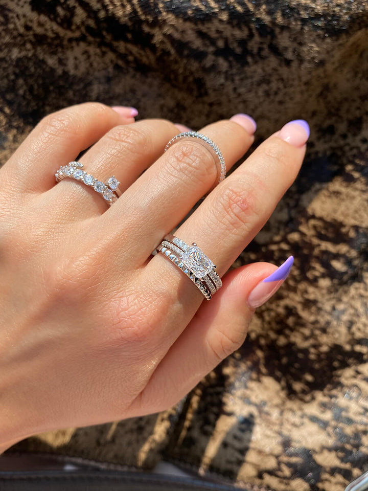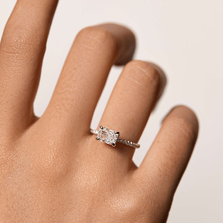 This handcrafted East West Radiant Pavé Ring elevates any outfit with its timeless elegance. Exquisitely crafted with a radiant-cut stone and encircled in a delicate pavé of crystals, this refined design adds a touch of sparkle and sophistication to your look. A divine choice for any occasion.