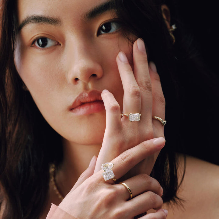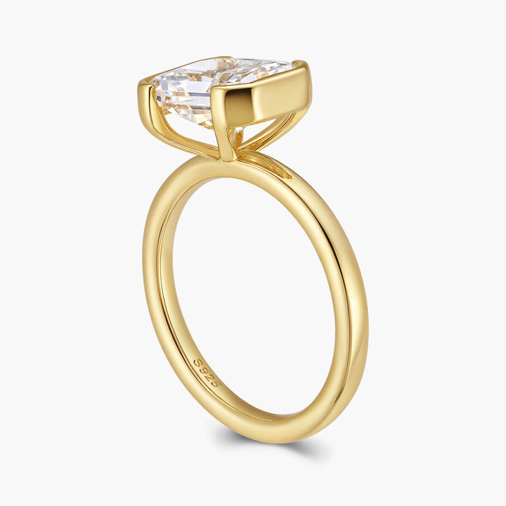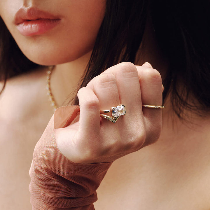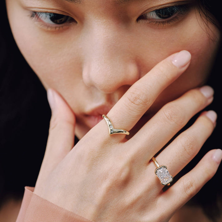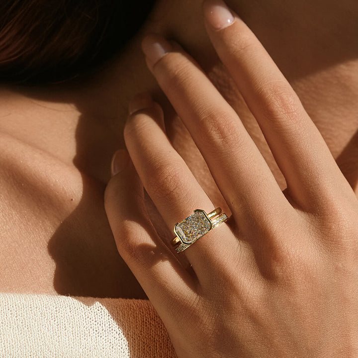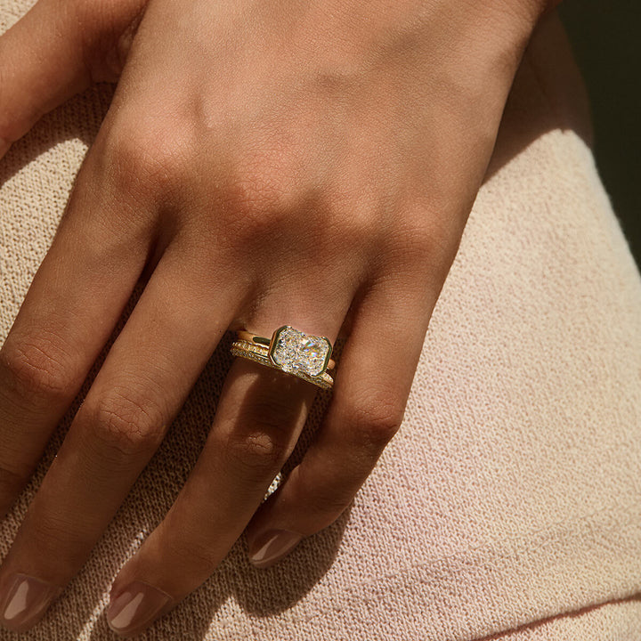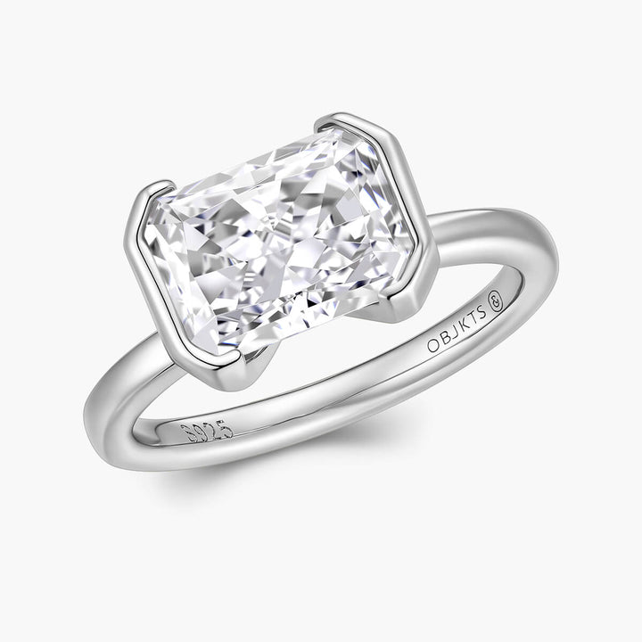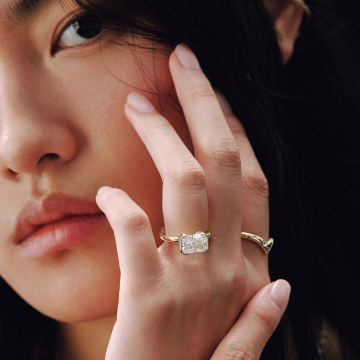 The Ella Ring showcases an east-west radiant cut stone elegantly secured in a half bezel setting. This design highlights the gem’s unique shape while offering a sleek, modern silhouette. Perfect for those who appreciate refined craftsmanship and contemporary style, the Ella Ring combines sophistication with subtle edge.