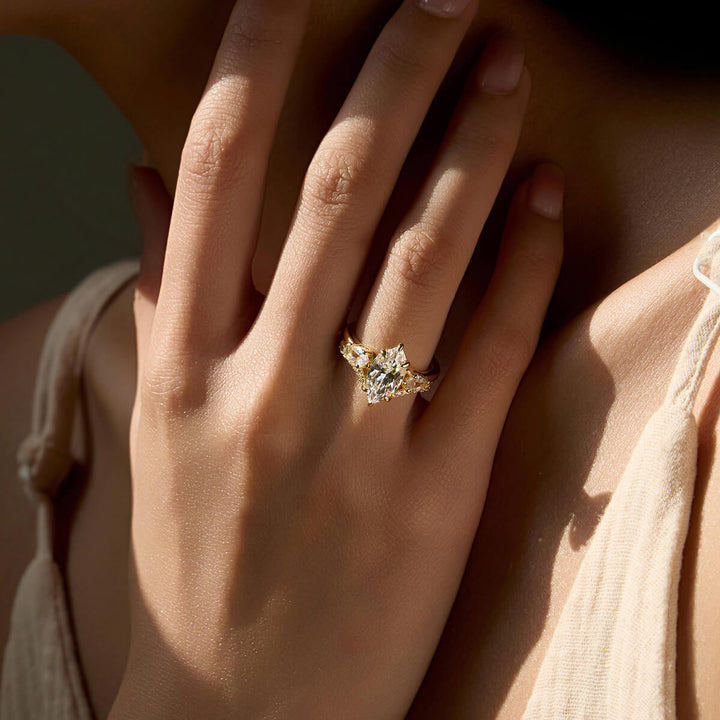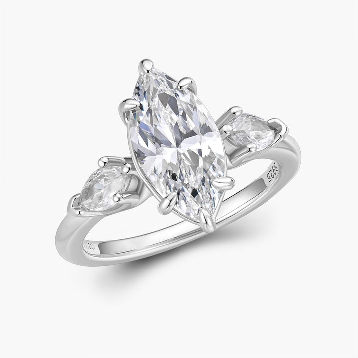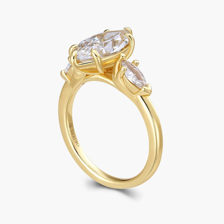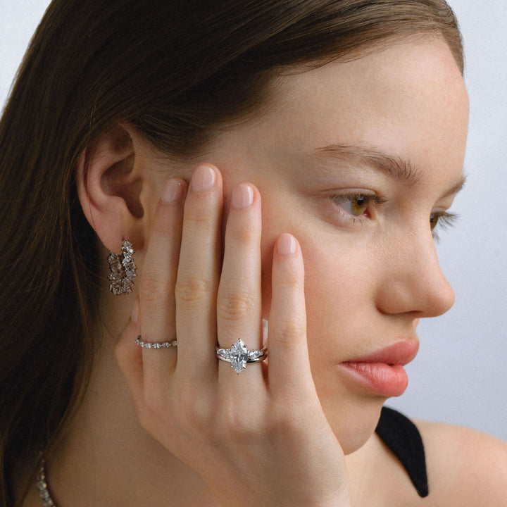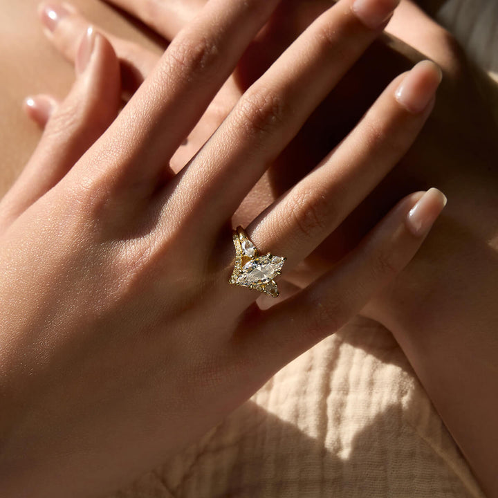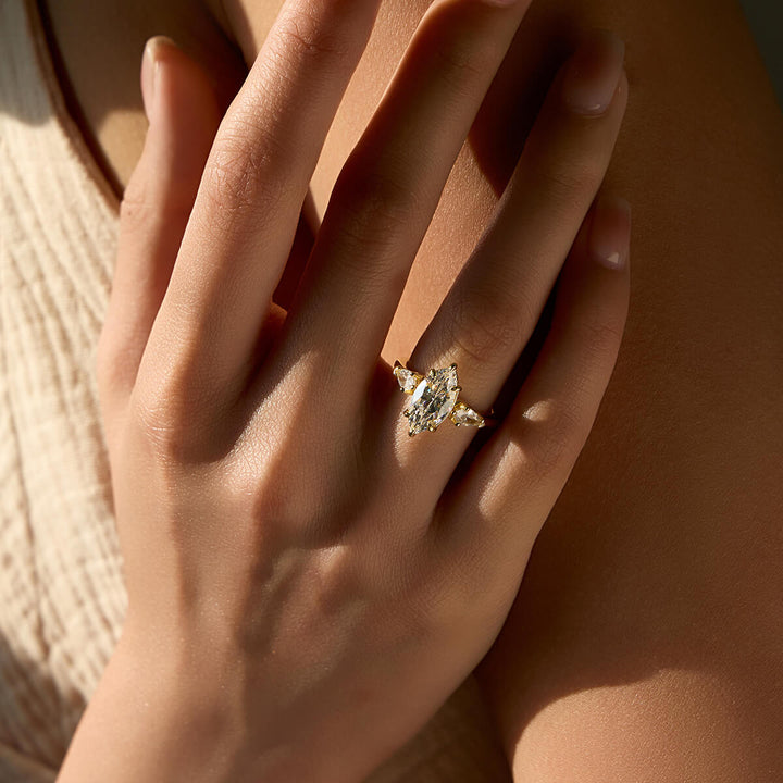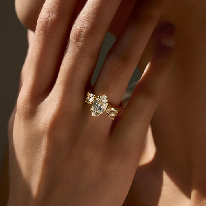 Delicate yet striking, the Elora Ring features a trio of marquise-cut stones, with a bold centre stone framed by two side stones. This balanced design creates an effortless sense of movement and elegance, making it a perfect piece for those who love a touch of vintage charm with a modern edge.