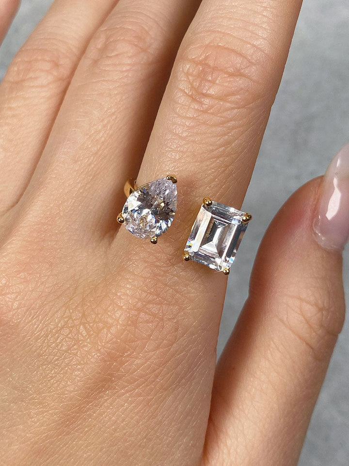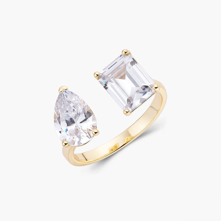 Take a risk and step out of your comfort zone with this Emerald X Pear Open Ring! Its amazing two stone design is guaranteed to turn heads and attract attention. Unique and daring, this ring will make you stand out from the crowd - daring adventure awaits!