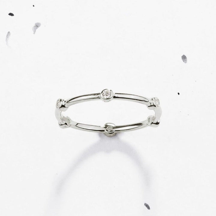 - Feather light thin stacking ring with bezel briliiant round stones