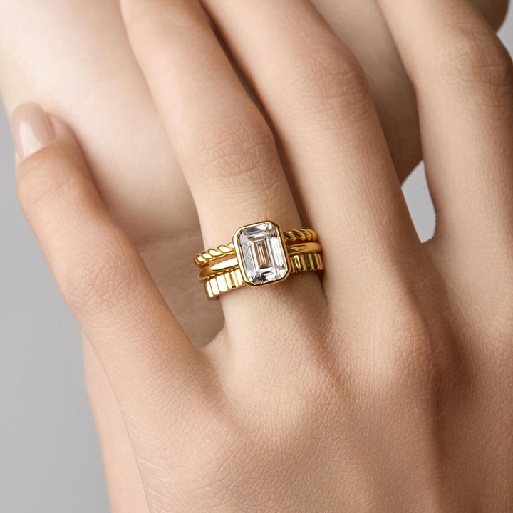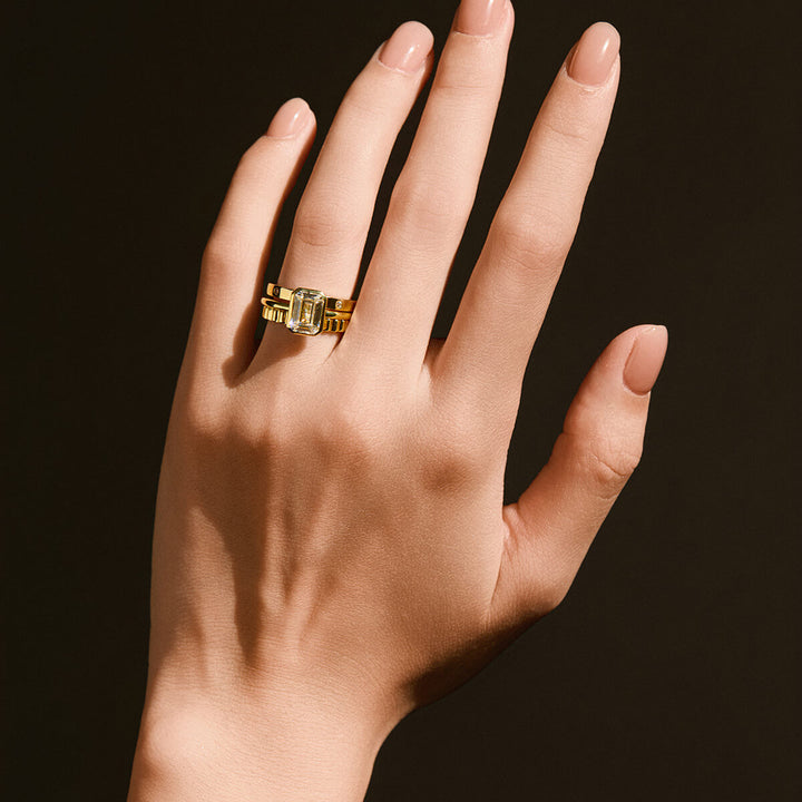 Meet the Giselle Ring: an elegant emerald-cut gemstone set in a sleek bezel setting for a polished, modern look. The clean lines of the bezel highlight the stone's striking shape and brilliance, creating a timeless piece that stands out. Perfect for stacking or wearing solo, the Giselle Ring adds a touch of refined sophistication to any collection.