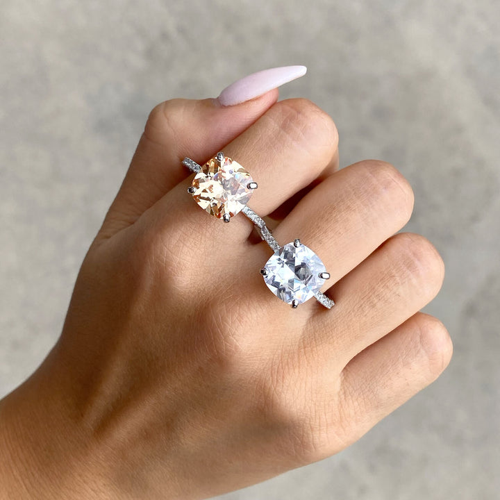 The Glacies Cushion Cut Ring ✨We are OBSESSED. Cut from the highest quality Cubic Zirconia stone & featuring a paved double halo base, raising the stone to allow for effortless stacking whilst sitting on a paved 925 Sterling Silver band.