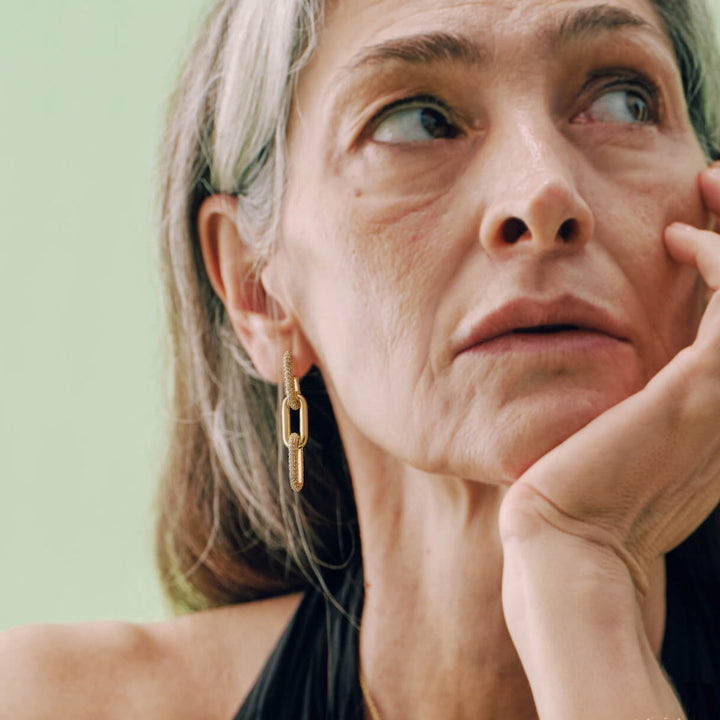 Make a big impression with these Half Pave Chain Earrings – they'll turn heads everywhere you go! Not your average drop earrings, these are designed with a blend of sparkles, chains, and links that will take your style to the next level. Perfect for special occasions, these earrings will have you shining all night long.
