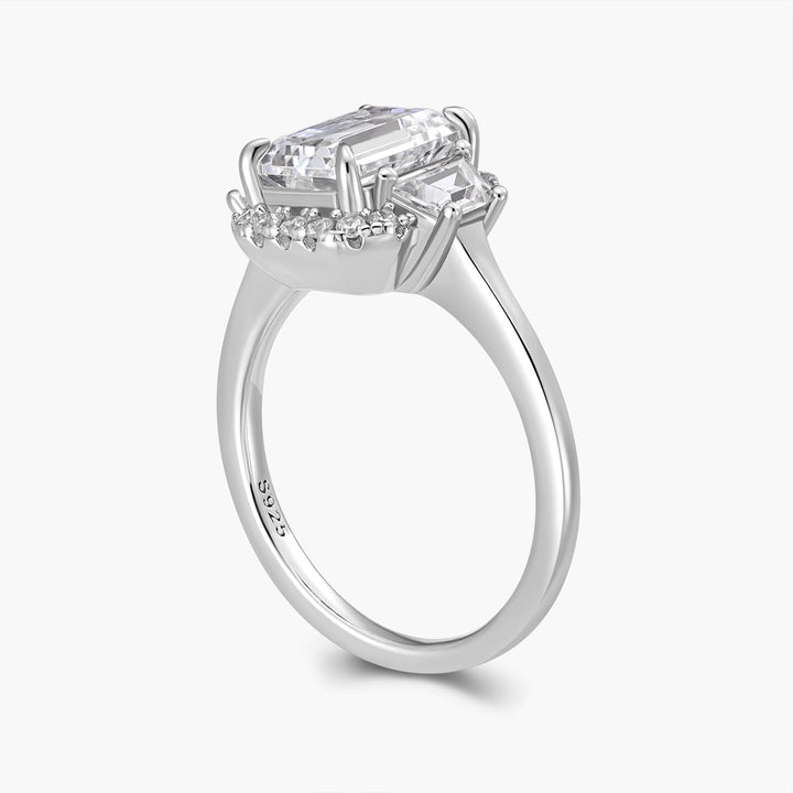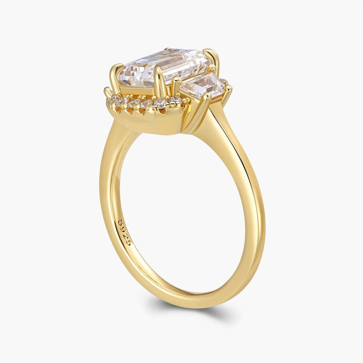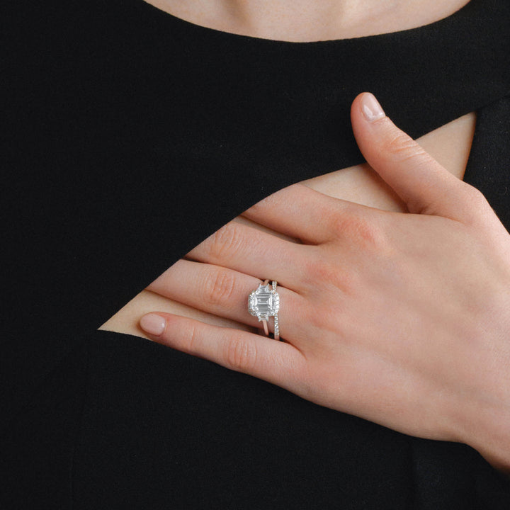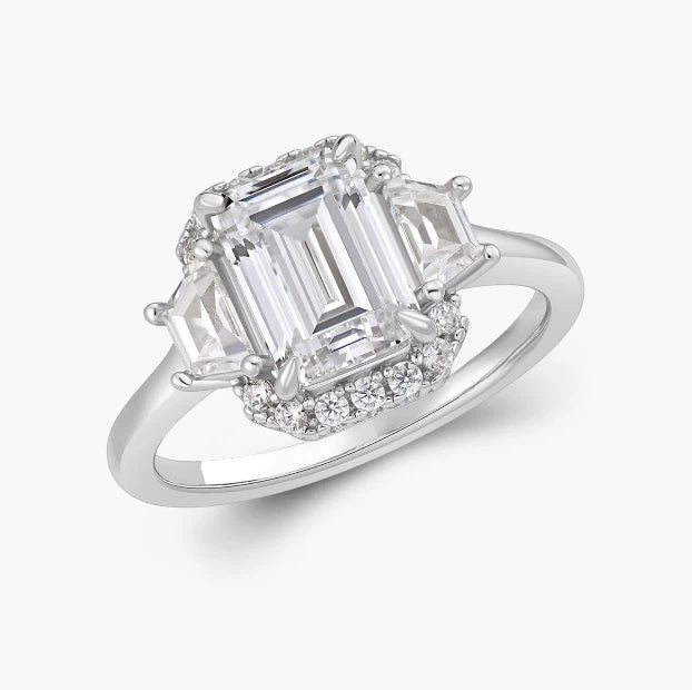 The Imogen Ring is a perfect blend of vintage elegance and modern refinement. Featuring a striking emerald-cut centre stone, framed by tapered baguette side stones and a delicate halo, this design creates a beautifully structured silhouette with incredible sparkle. Timeless, sophisticated, and effortlessly chic—Imogen is a true classic with a contemporary edge.