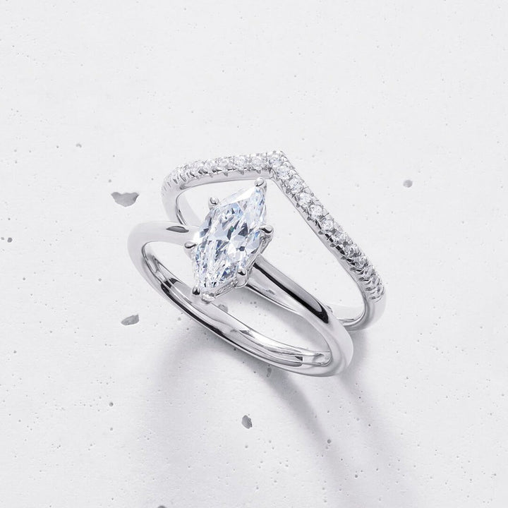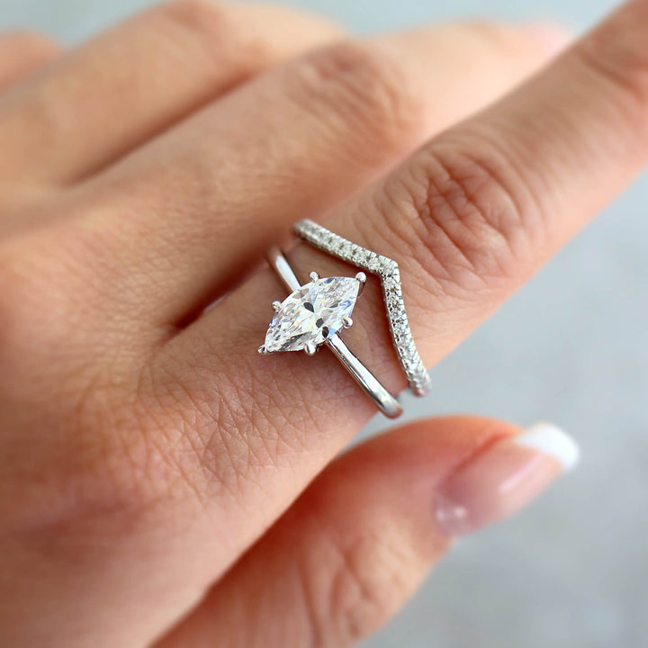 - 100% 925 Sterling Silver- Rhodium-plated- 2 piece set: Marquise stone plain band, paved stacking band- Cubic Zirconia stone