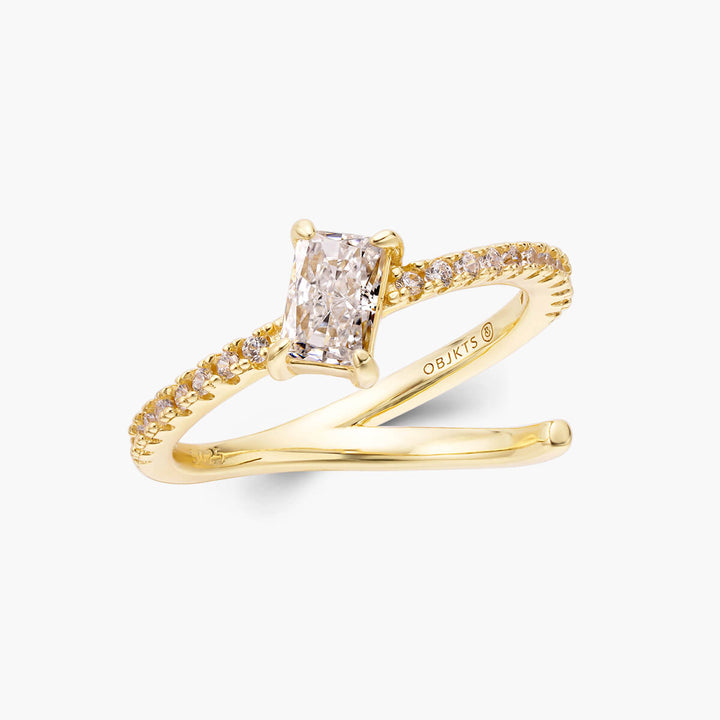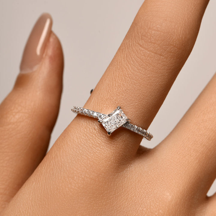 The Iona Ring features a unique and radiant cut stone mounted on an ascending paved band. Its elegant design and sparkle make it an eye-catching accessory that you can wear to accentuate any ensemble.