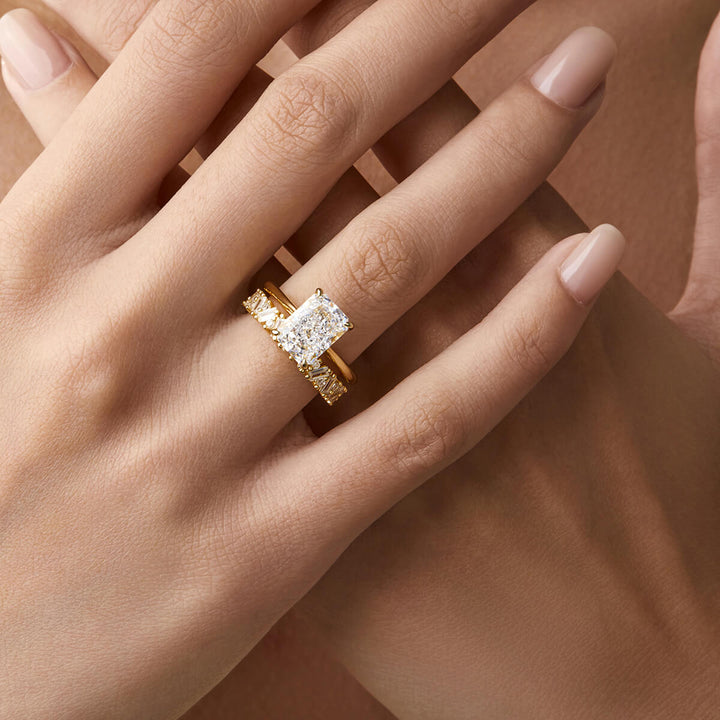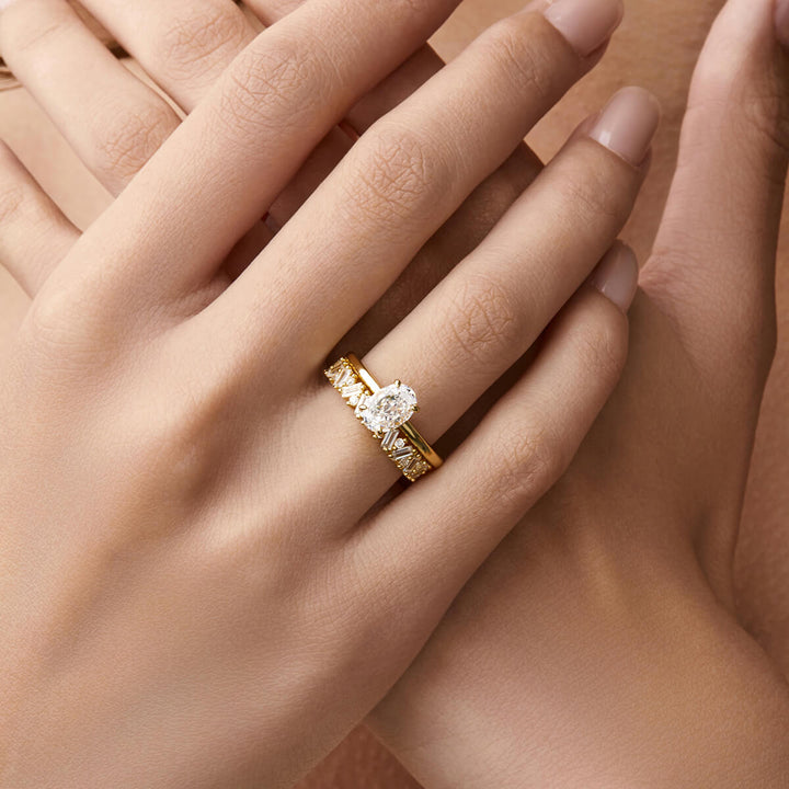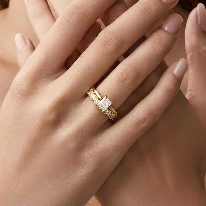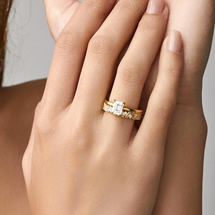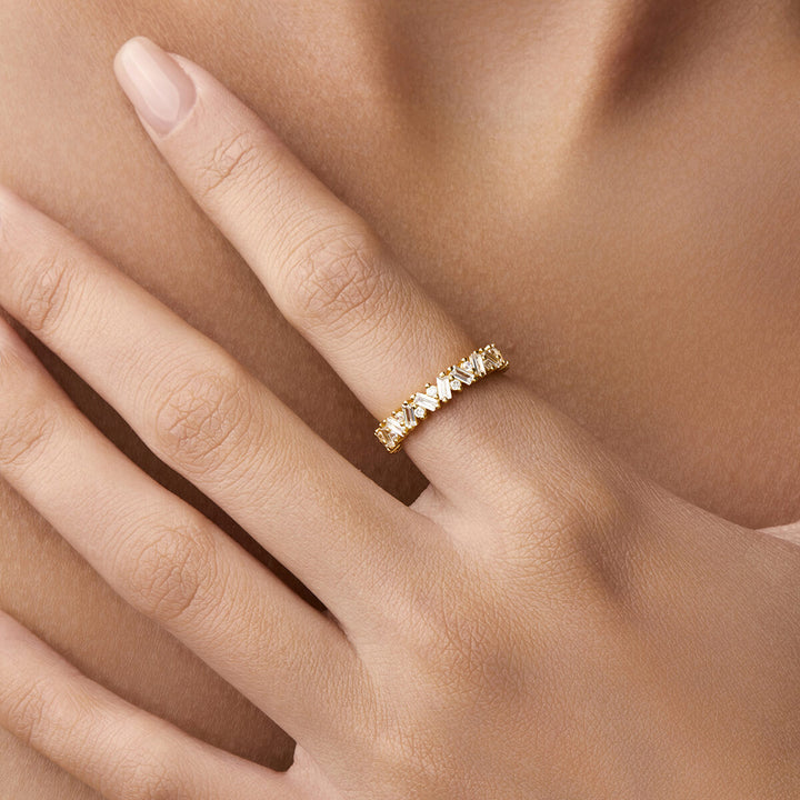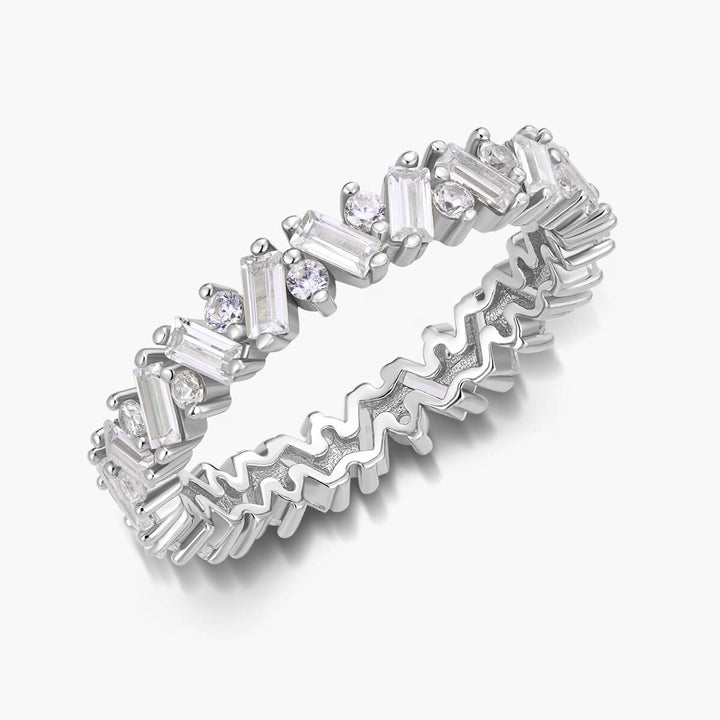 Discover the Kiera Band: a unique eternity ring featuring a stunning alternating pattern of baguette-cut and round stones. This captivating design brings a dynamic play of shapes and sparkle, offering a fresh take on the classic eternity band. Perfect for stacking or wearing alone, the Kiera Band adds a touch of modern elegance to any collection.