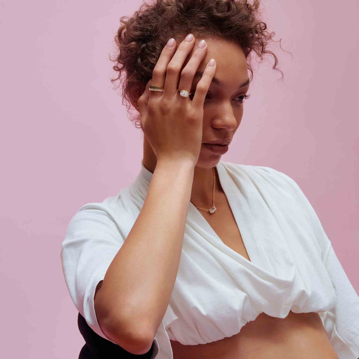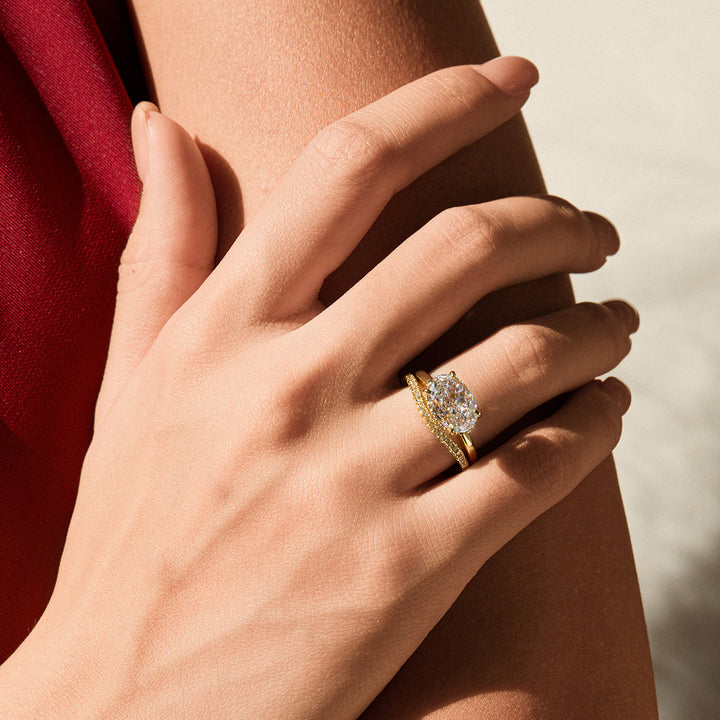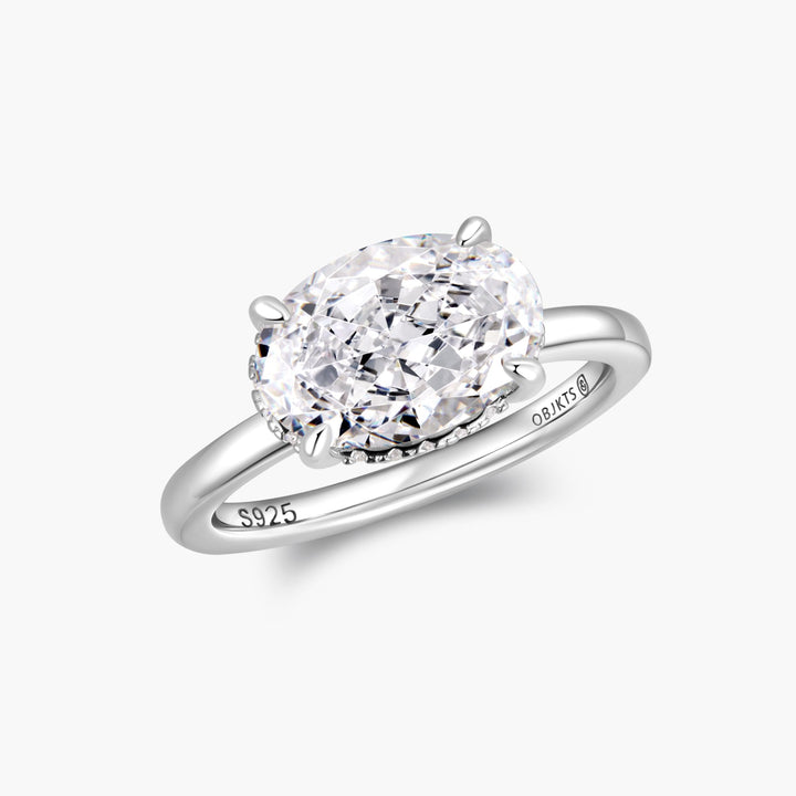 The Kira Ring showcases an east west set oval-cut stone, accented by a subtle hidden halo for a soft, radiant glow. Its streamlined design offers a fresh twist on a classic silhouette.