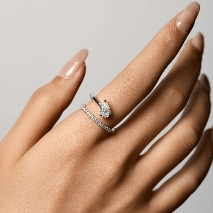 Gaze upon the beauty of the Lina Ring - its delicate floating pear stone and sparkly paved band will have you under their spell in no time! Add a unique touch of magic to any look with this one-of-a-kind bling! #selfcarewithstyle