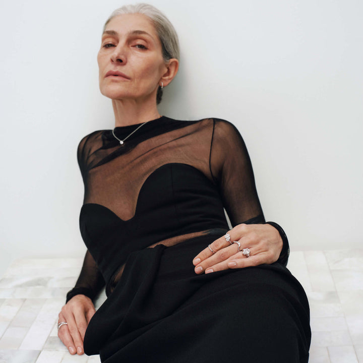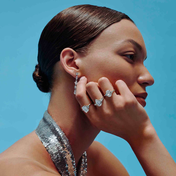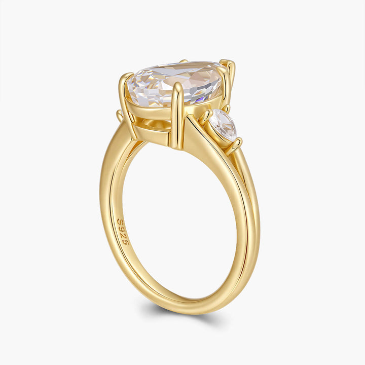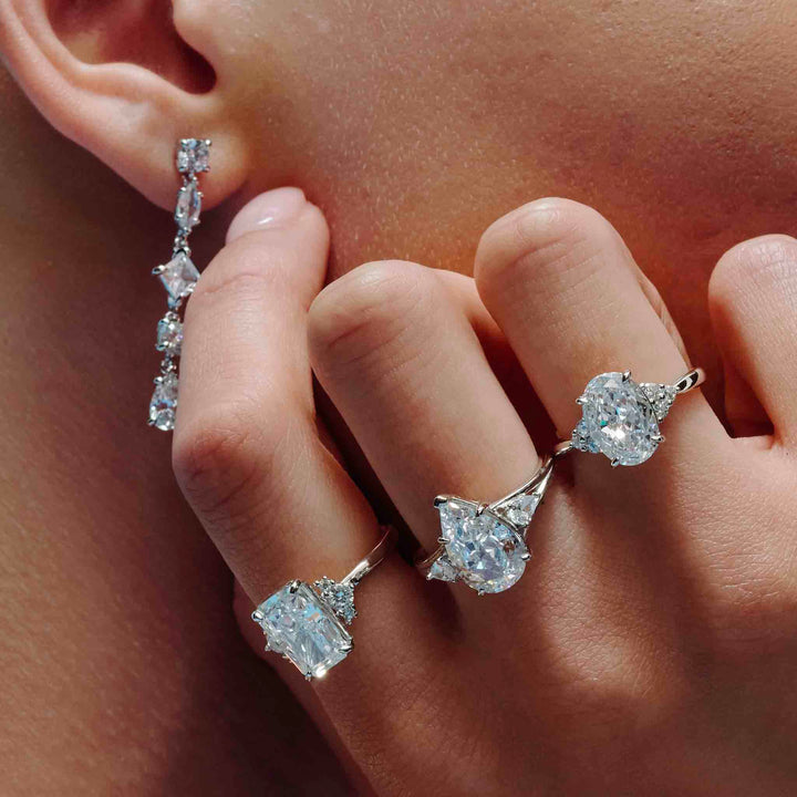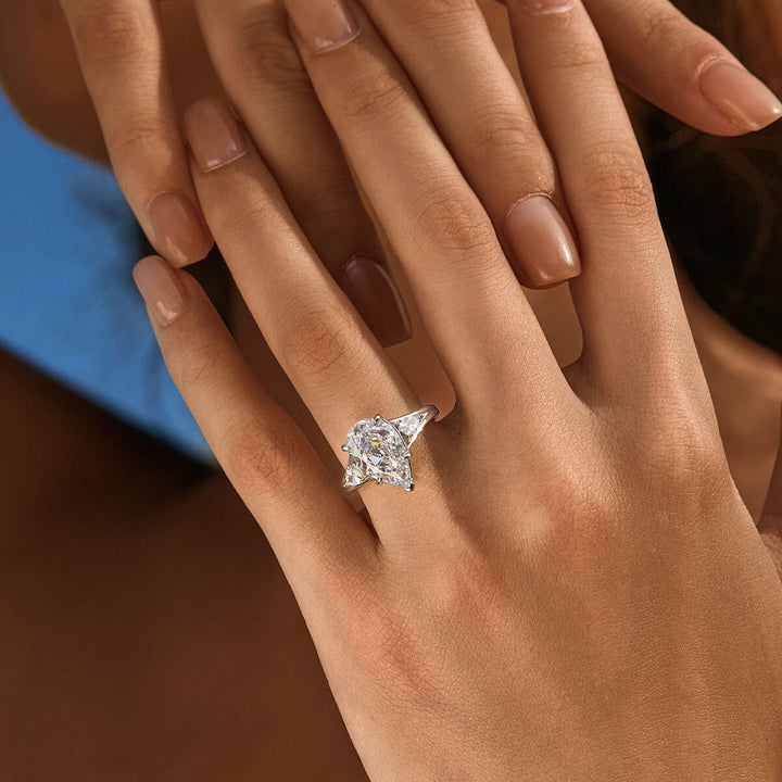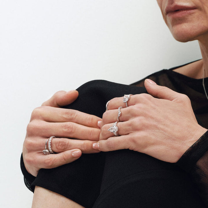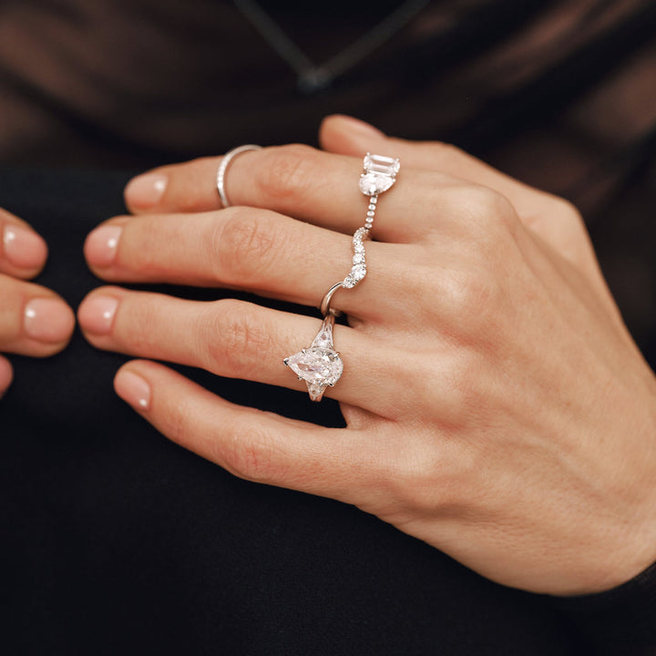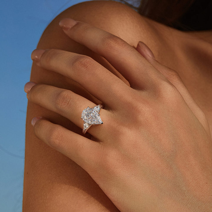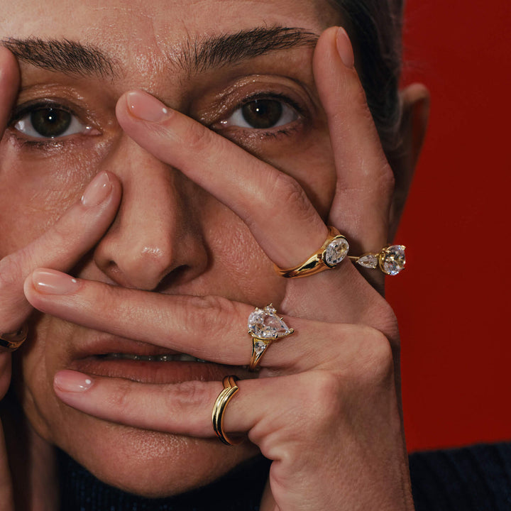 Delicate yet distinctive, the Mel Ring features a central pear-cut stone flanked by smaller pear-shaped accents in a graceful cluster setting. With its soft curves and balanced sparkle, it’s a romantic piece that adds elegance to any moment - perfect for stacking or standing beautifully on its own.