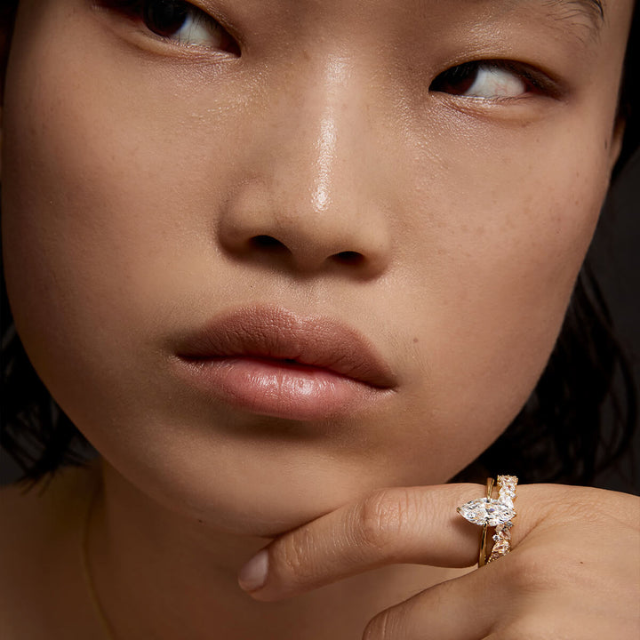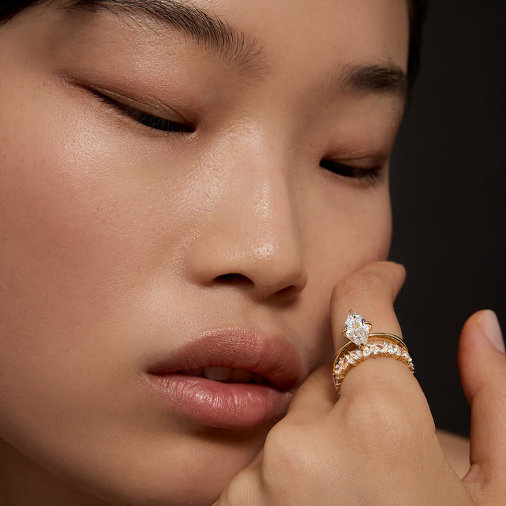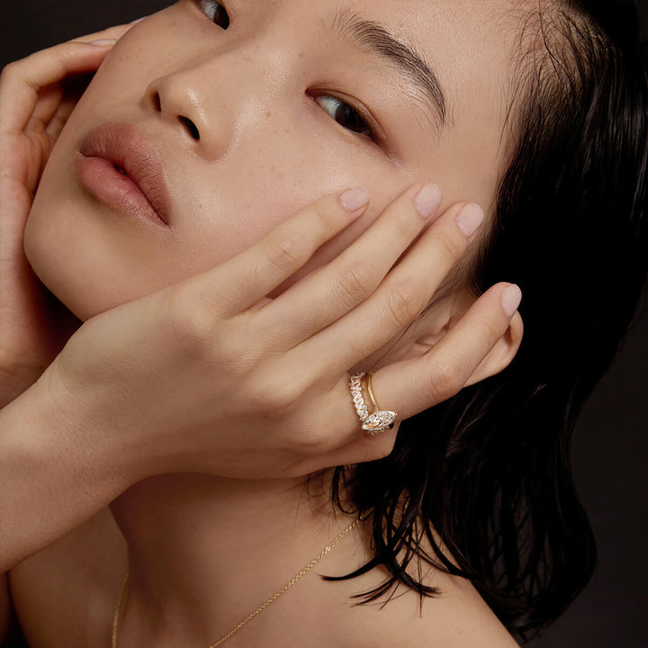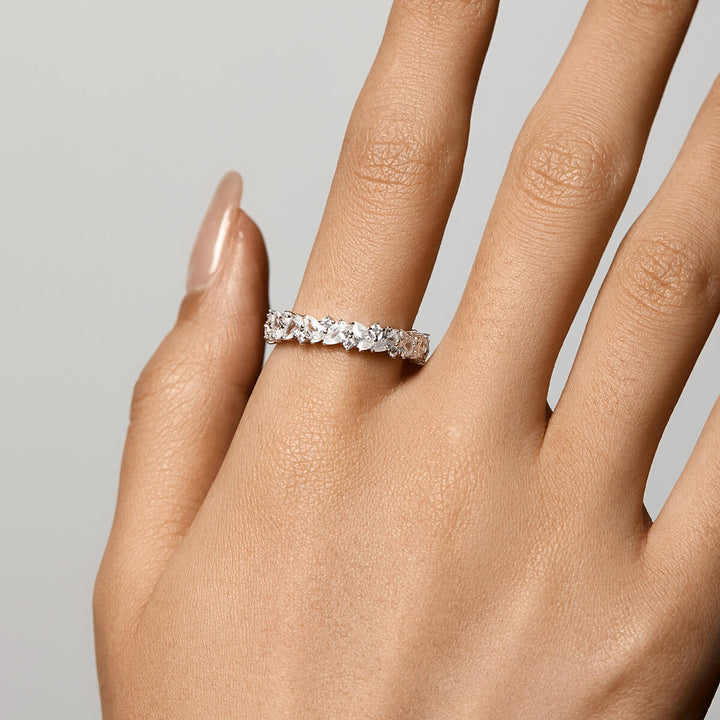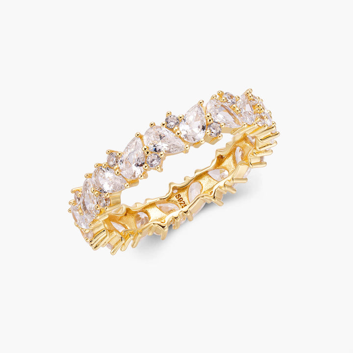 The Mila Ring is a stunning eternity band crafted from a combination of pear and brilliant round stones. The unique design shines with a brilliant sparkle, making it the perfect addition to any jewellery collection.