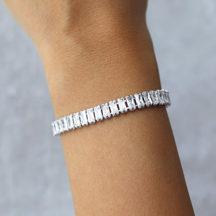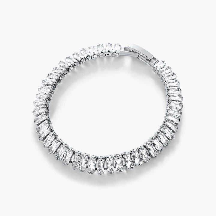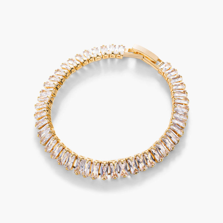 - Rectangular radiant cut crystal bracelet- Foldover clasp closure- Available in Rhodium-plated or 14K Gold-plated brass base, white cubic zirconia stonesCheck out the Milia Gold-plated Champagne stone bracelet here.