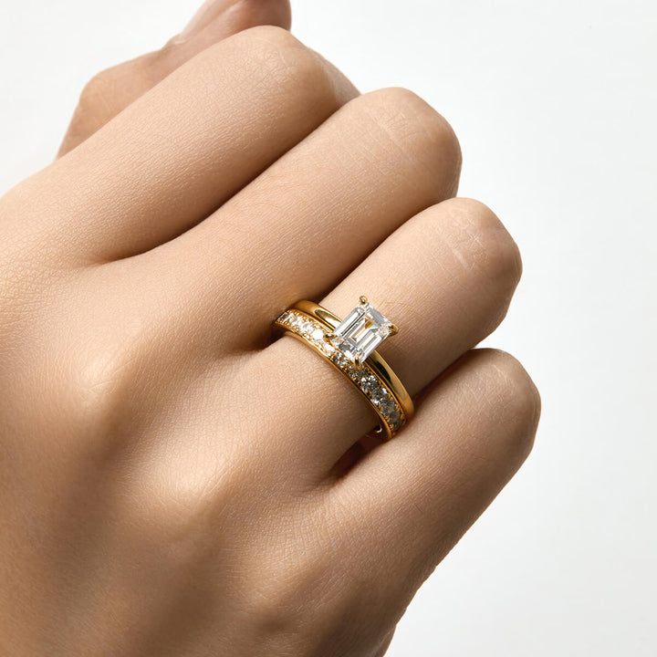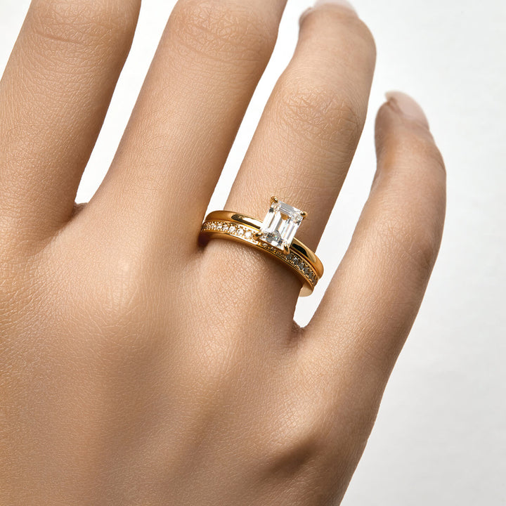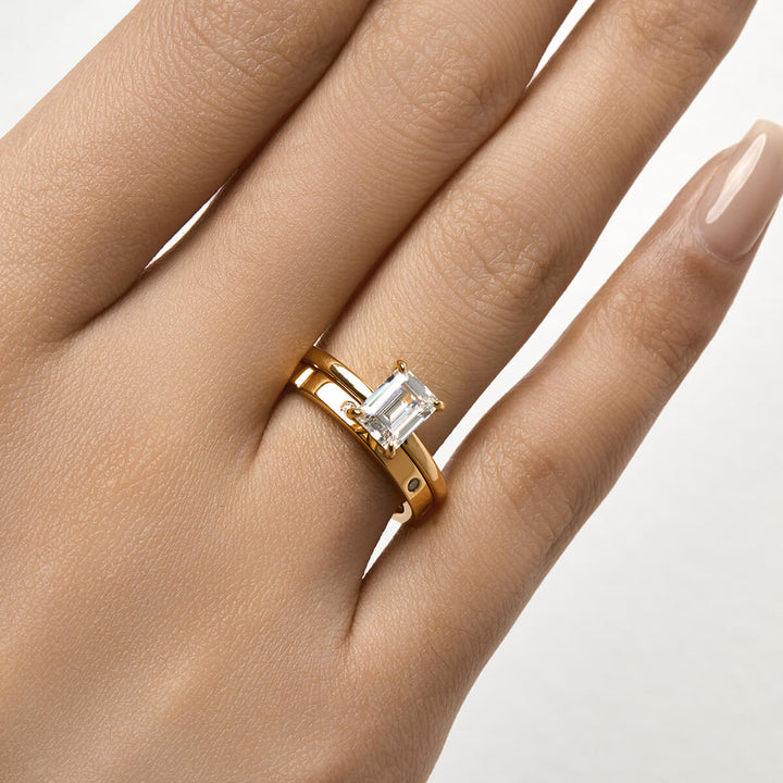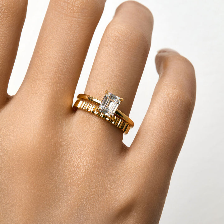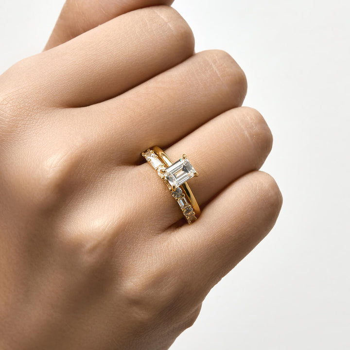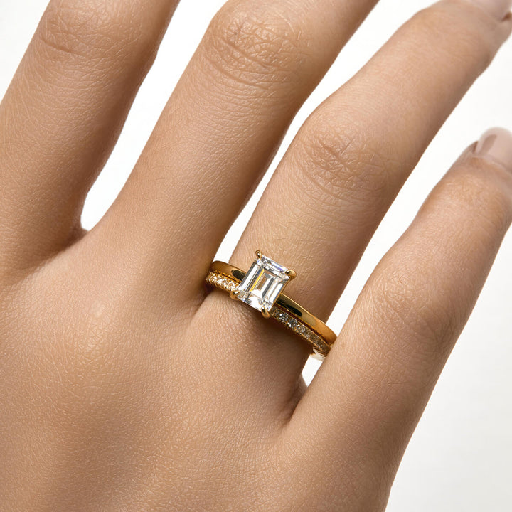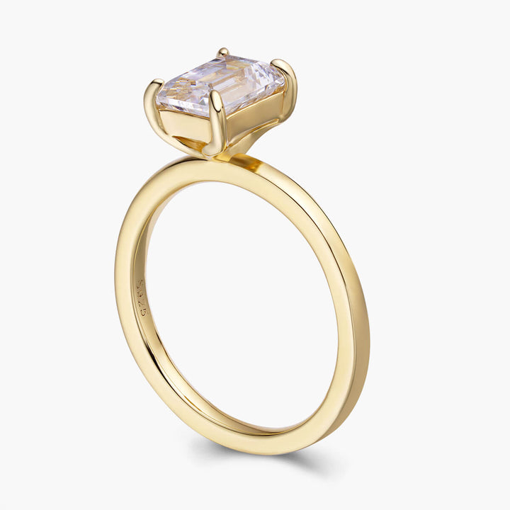 Discover the timeless beauty of the Mira Ring. Featuring a stunning emerald cut stone meticulously crafted onto a sleek and simple band, this ring exudes elegance and style. With its classic design and exquisite stone, it's the perfect accessory to capture attention.