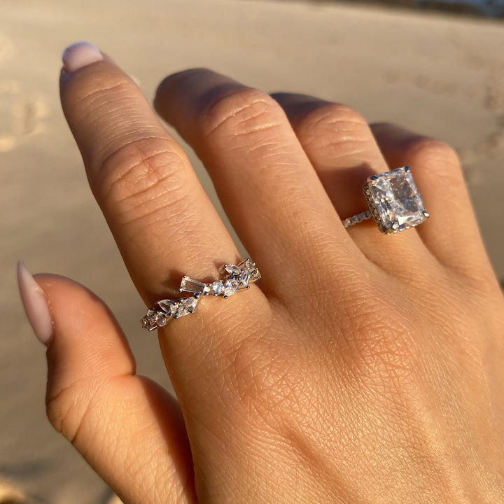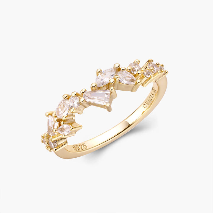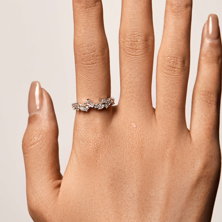 The Nyra Ring is a timeless classic, designed to be the perfect accessory for any occasion. This dainty multi-shape band creates a unified yet intricate look, crafted for a truly luxurious feel. Indulge in its simple charm and add a touch of sophistication to any ensemble.