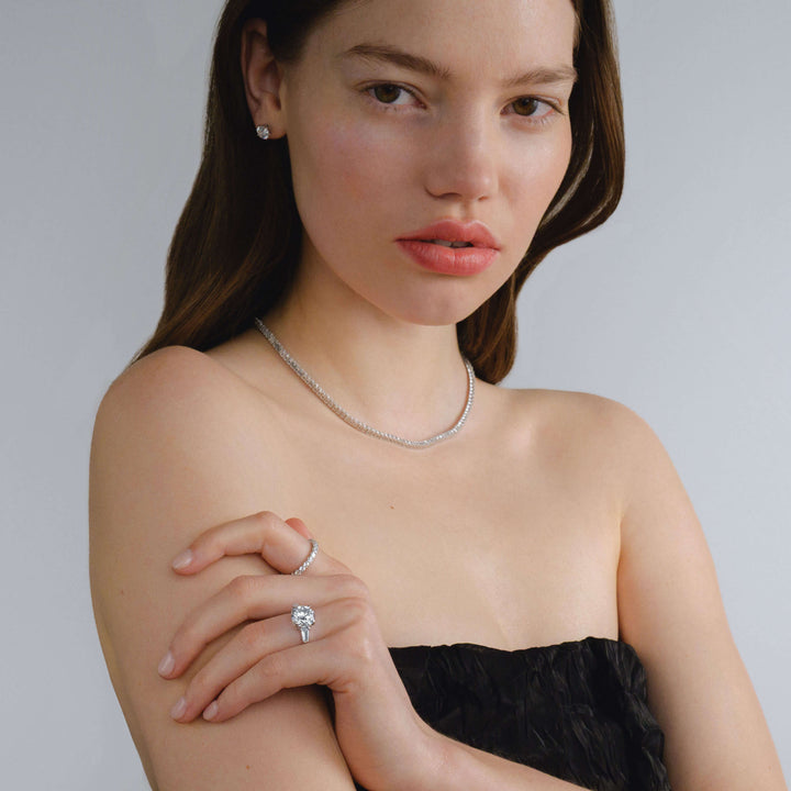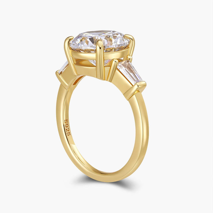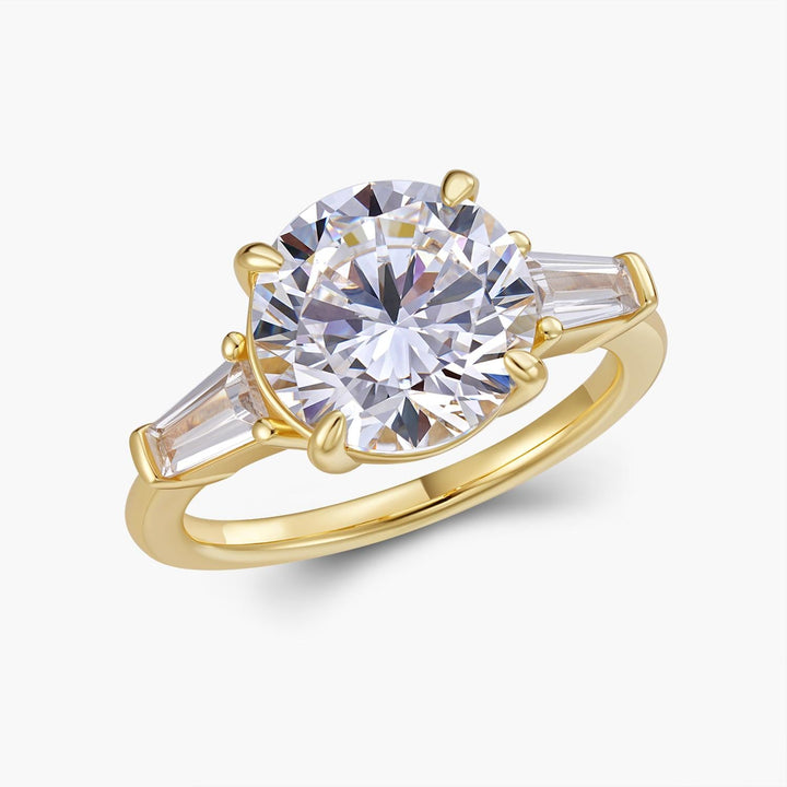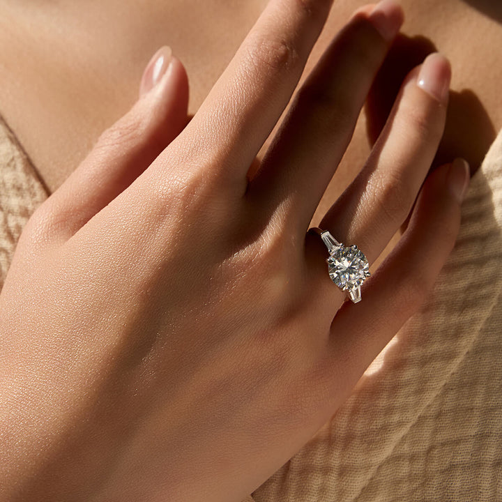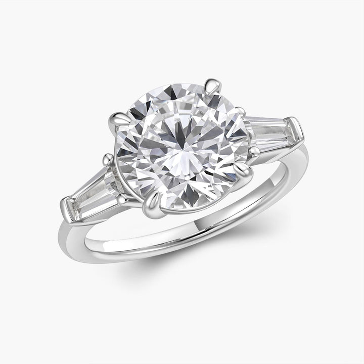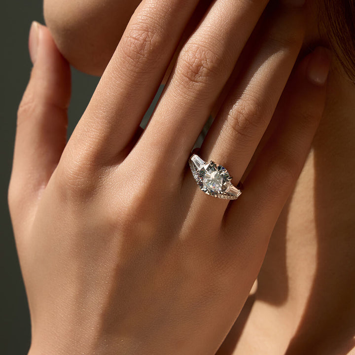 The Odette Ring is a stunning celebration of elegance and sophistication. At its heart lies a brilliant round centre stone, exuding timeless sparkle, while the tapered baguette side stones add a touch of modern flair and architectural beauty. This exquisite combination creates a harmonious balance of classic and contemporary design, making the Odette Ring a perfect choice for those who appreciate refined luxury.
