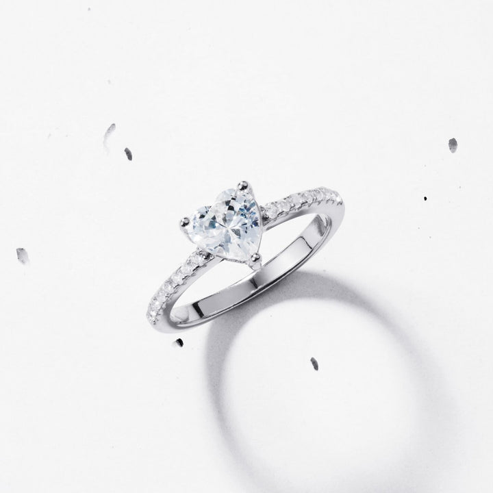 - 100% 925 Sterling Siver- Heart-cut cubic zirconia stone, paved band- Stone height 6mm, surface height: 1mm - Rhodium-plated or 18k Gold plating
