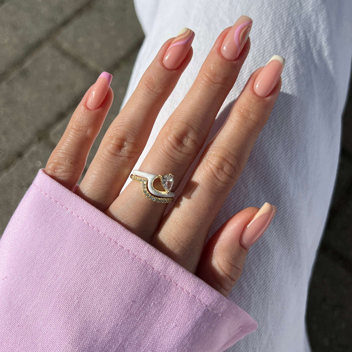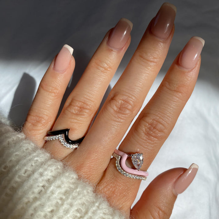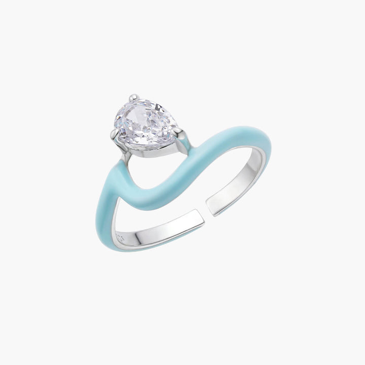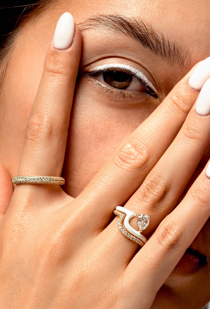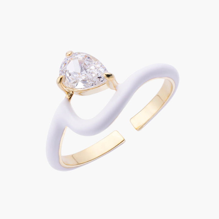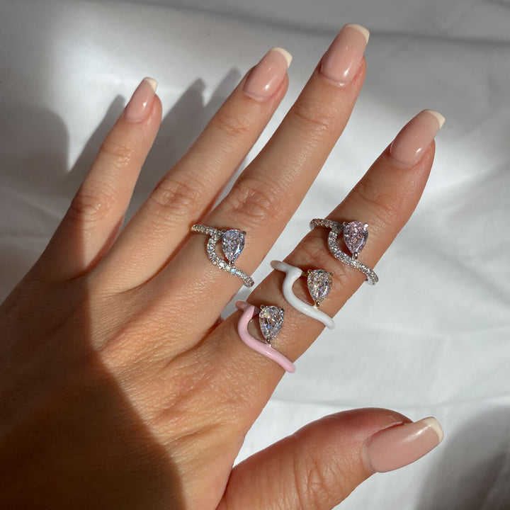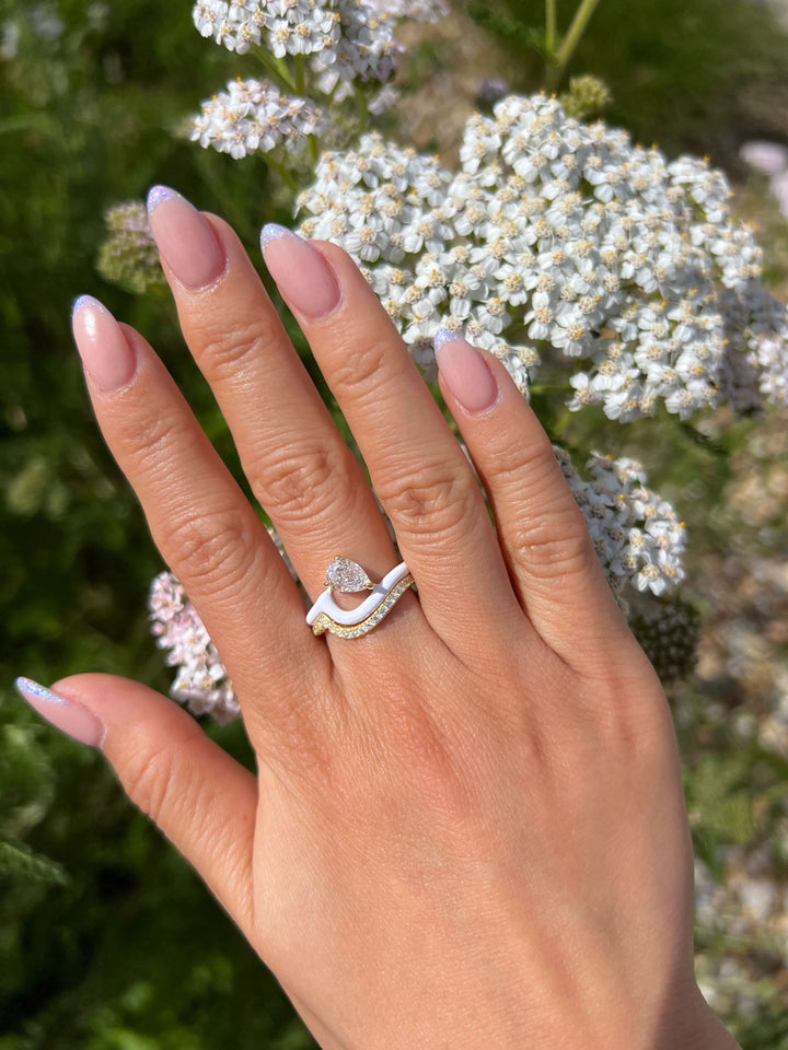 Meet the beautiful Perle ring, available in Plain, Pave or Enamel. This enchanting ring will be your new summer go to. With its unusual and elegant shape, matched with a Crushed ice Pear Cut stone, this ring will let you turn up the heat this season. Pair this with our Pave Flux Ring for extra shimmer.