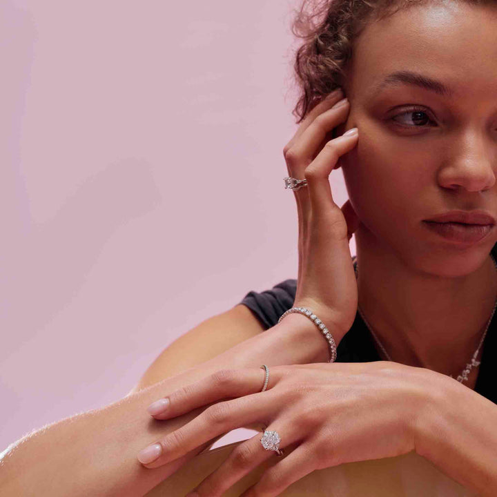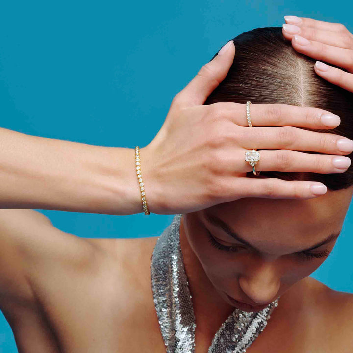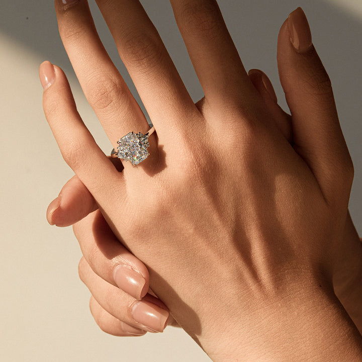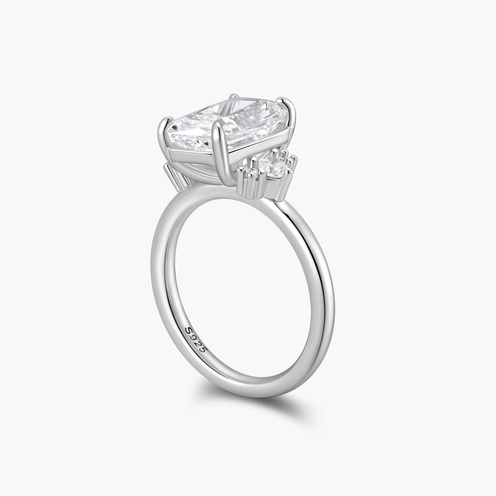 Striking and refined, the Rae Ring features a radiant-cut solitaire that catches the light from every angle, accented by a trio of round side stones that add soft, shimmering brilliance. Its clean lines and balanced sparkle make Rae a timeless statement of modern elegance.