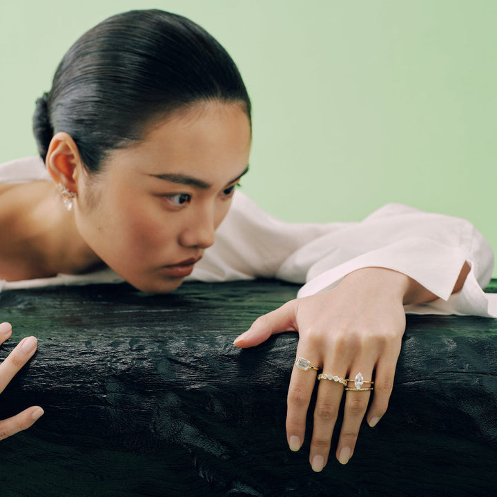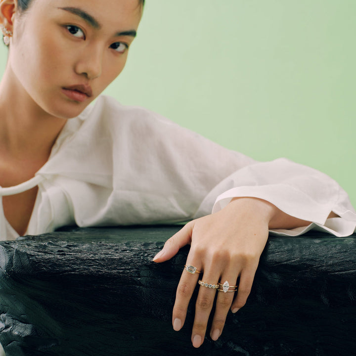 Add modern elegance to any outfit with the Roen Ring. The unique split shank design and east-west emerald bezel create a sleek and sophisticated look. Stand out from the crowd and elevate your style with this stunning piece.