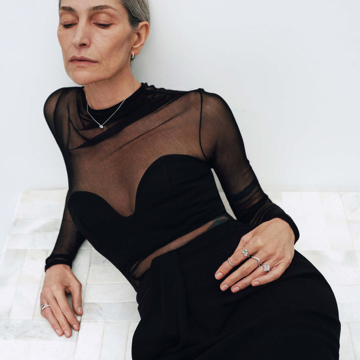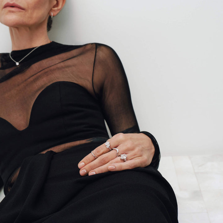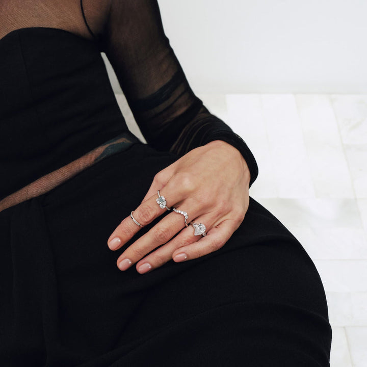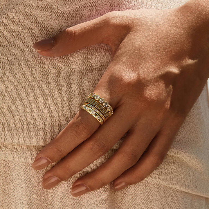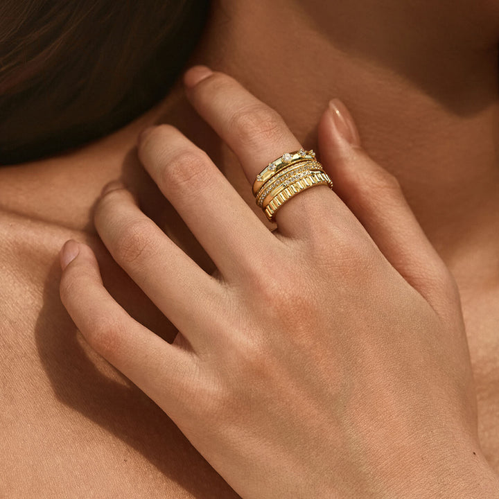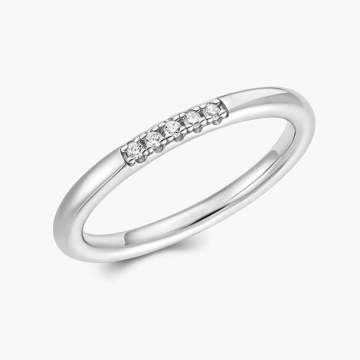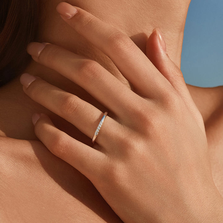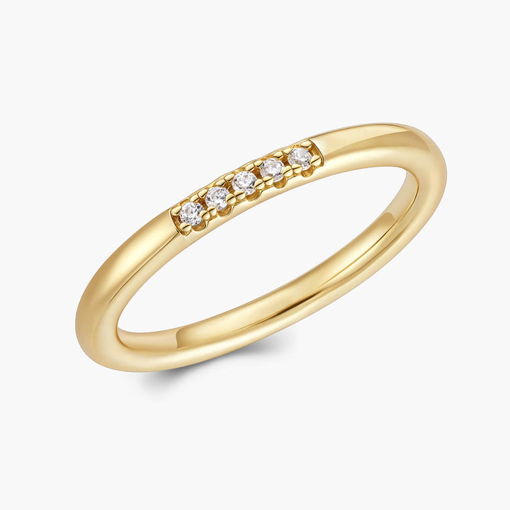 Delicate and understated, the Thea band features a sleek band accented with five small stones set in a neat line. Perfectly minimal yet sparkling with subtle charm, it’s an elegant addition to any stack or a refined statement on its own.