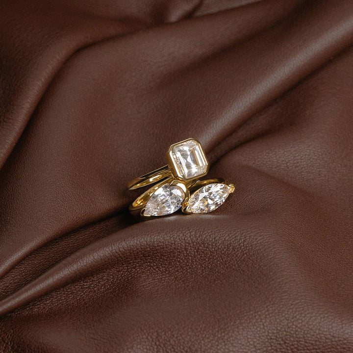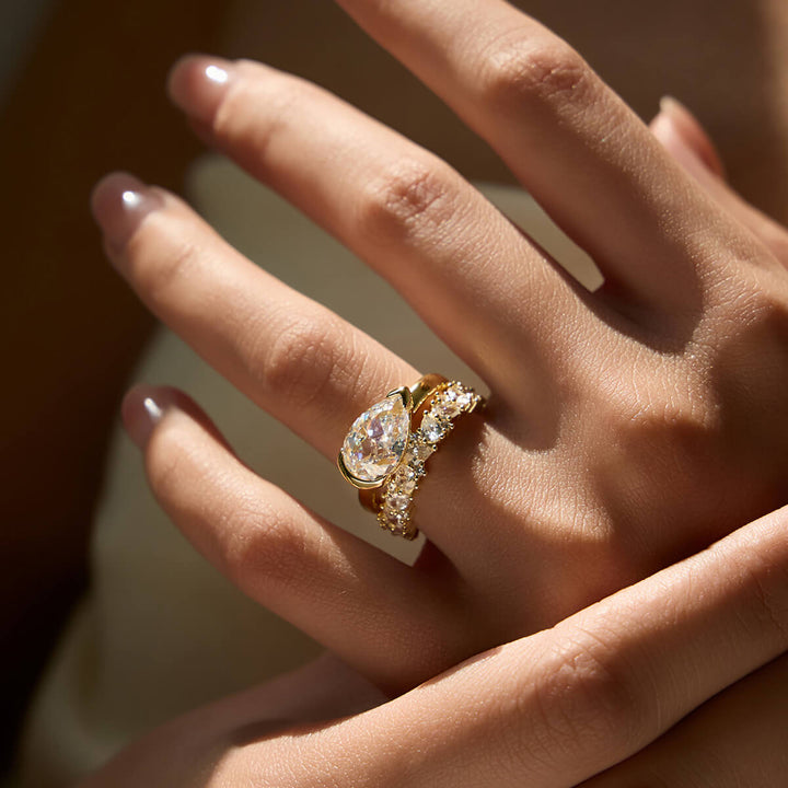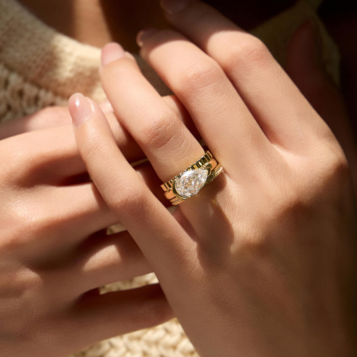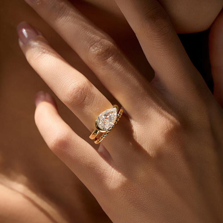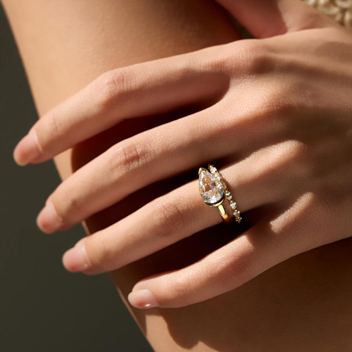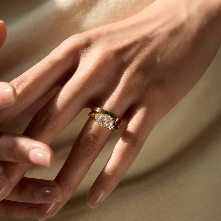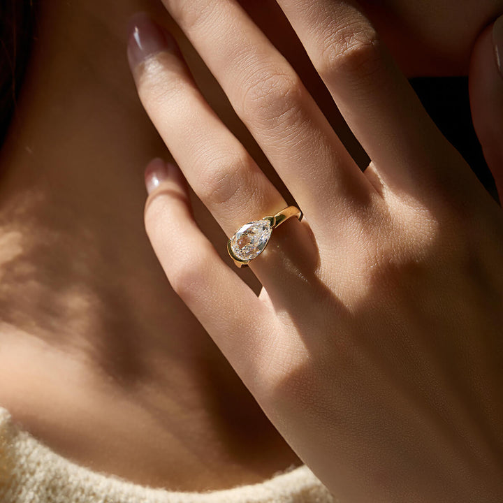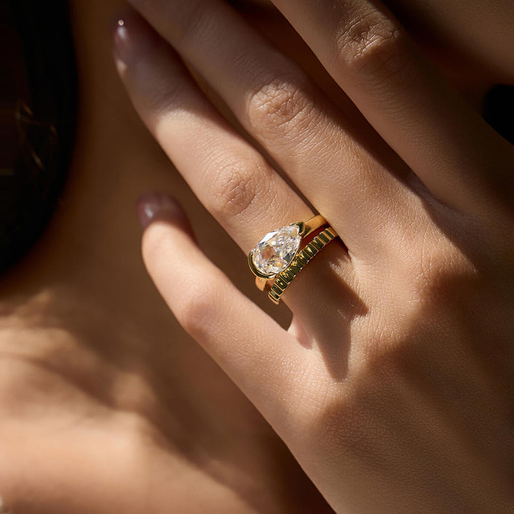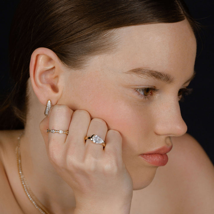 A fresh twist on a classic shape, the Tiera Ring features a pear-cut stone set in a sleek east-west orientation. The half bezel setting adds a modern touch while letting the stone shine. Effortlessly elegant and easy to wear, it’s a perfect balance of bold and refined.