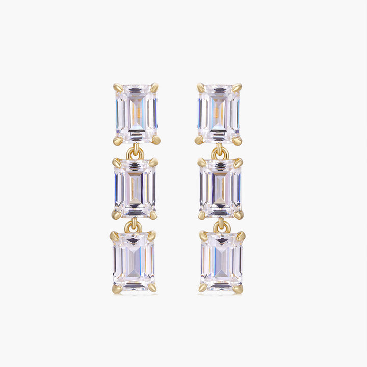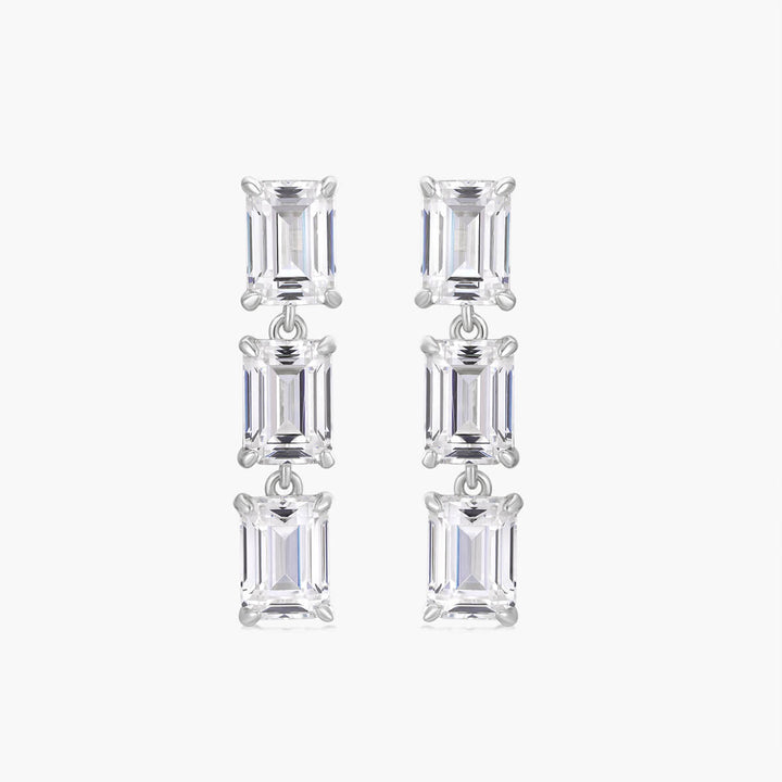 Indulge in the elegance of these emerald cut drop earrings. The chain of emeralds adds a touch of sophistication to any outfit, while the stunning emerald cut stones catch the light and add a subtle sparkle. Enhance your look with these exclusive and luxurious earrings.