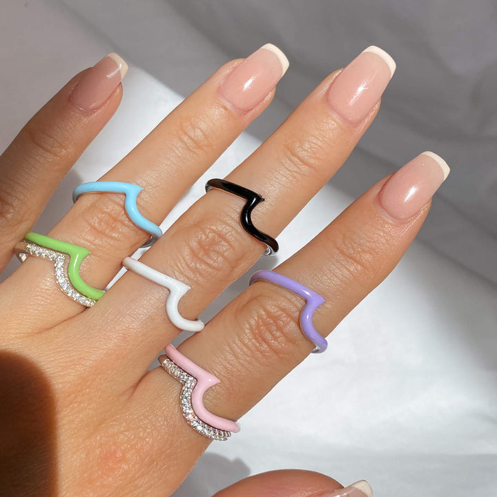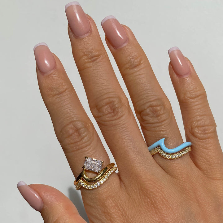 Feel the waves with this stackable set of striking rings, perfect for those summer nights. Bright coloured enamel available in 6 vibrant shades. Carefully designed to stack so you can style them your own way. Stack this with our Pave Flux Ring or even flip it upside down and layer it on the Vagues Ring to create the perfect ensemble. This ring is a top stacker.